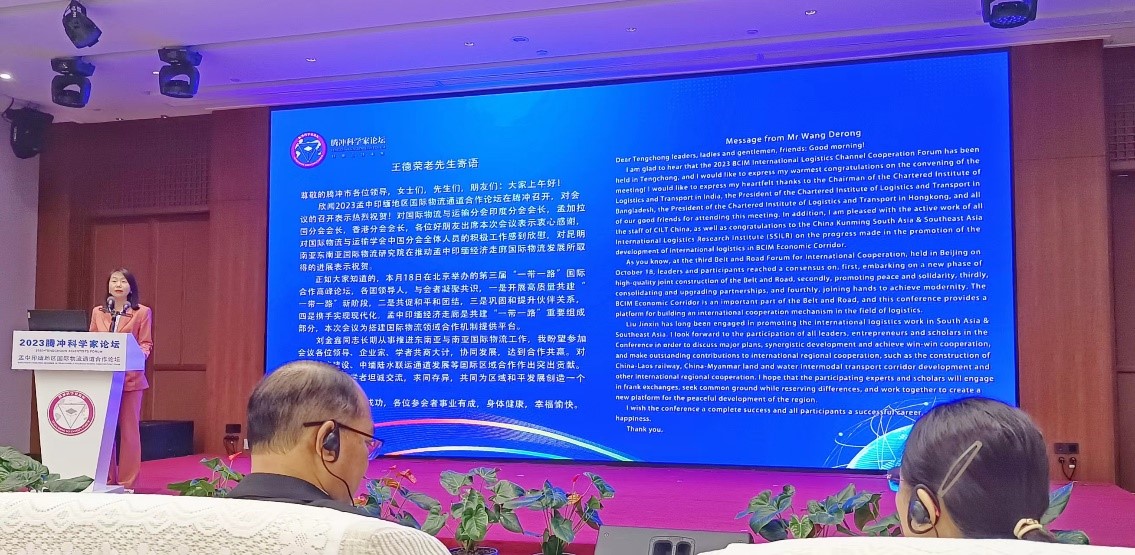 On 22nd October 2023, thee 2023 BCIM International Logistics Channel Cooperation Forum was held in Tengchong, China. Mr.Wang Derong, the Founder of China International Logistics Development, Charted Fellow of the Chartered Institute of Logistics & Transport(CILT), Former Executive Vice President of China Communication and Transportation Association, Founder and the 1st Chairman of the Chartered Institute of International Logistics & Transport China(CILT China), Chief Advisor of Kunming South Asia and Southeast Asia International Logistics Research Institute, has sent the Congratulation Letter to the Forum to express his warmly congratulation.
