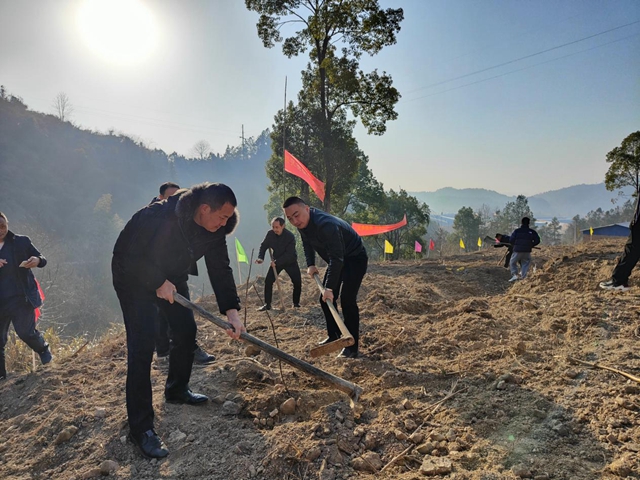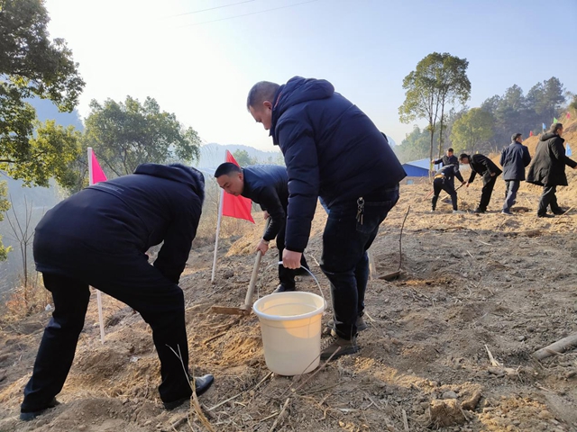 1月30日上午,暖阳高照,天气晴好,新化县上渡街道党工委书记陈望林、主任伍易率街道机关120余名干部职工到梽木山村开展义务植树活动。
