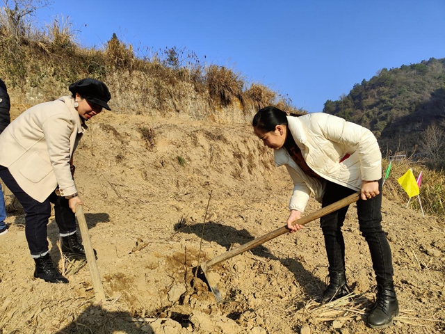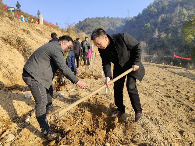 当天上午9时许,义务植树队伍来到梽木山村十二组义务植树基地,在街道林业站技术人员的指导下,大家自觉搭配成小组,相互配合,挖坑植苗,浇水培土,通过近两个小时的努力,2000余棵桔、梨、桃等果木树苗全部植入基地的20余亩荒地之中,为大地增添了一片片新绿。(文/图 阳家友 邹少波)
