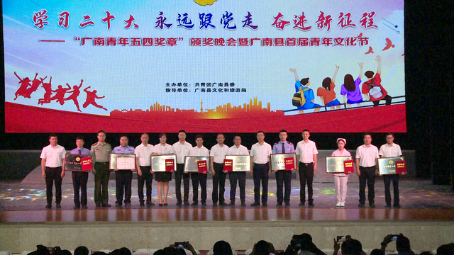 晚会上,全体人员学习了广南县荣获“文山青年五四奖章”“广南青年五四奖章”的14名优秀个人及9个先进集体的先进事迹,在家的县四班处级领导和共青团文山州委有关领导为荣获“广南青年五四奖章”的优秀个人和先进集体颁奖。