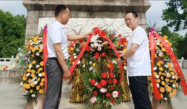 活动启动仪式在麻城烈士陵园广场举行,驻世英村联合工作队及黄石市开发区•铁山区太子镇世英村全体党员在黄麻起义和鄂豫皖苏区革命烈士纪念碑前肃立,世英村“两委”代表全体党员向黄麻起义和鄂豫皖苏区革命烈士纪念碑敬献花篮,黄石市妇幼保健院驻世英村联合工作队第一书记、工作队队长刘艳云及世英村党支部书记、世英村村委会主任程时树整理花篮缎带。