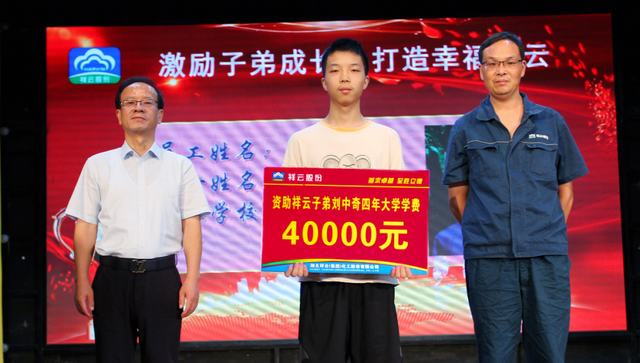 ▲祥云股份党委书记、董事长胡华文(左一)为考上上海交通大学的困难子弟刘中奇颁发祥云奖学金和助学金。