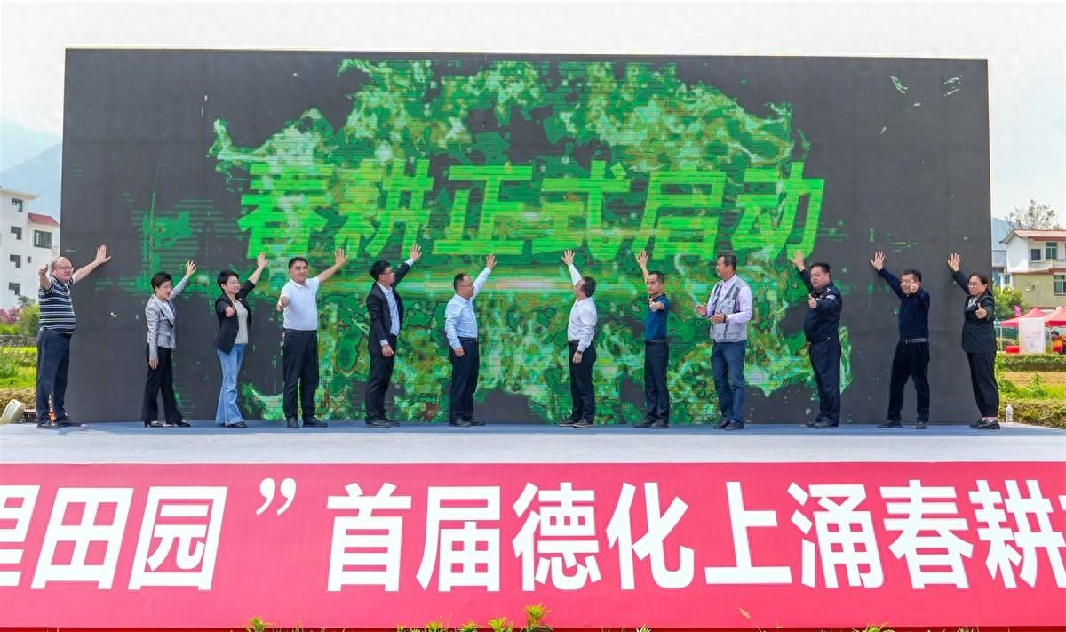泉州市委办公室务会成员、市档案局局长、市档案馆馆长廖晓凌,德化县委常委、组织部长熊建军,福建省摄影家协会副主席朱庆福,泉州市林业局基金中心副主任、高级会计师胡金地,泉州市看守所所长张光武,德化县上涌镇党委书记林其粮,汤头乡党委书记涂瑞萍,葛坑镇党委书记林建兴,桂阳乡党委书记赖宝彬,杨梅乡党委书记柯进福,德化县农业农村局农机化发展中心主任徐文瑜,德化县文旅局旅游事业发展中心副主任蔡丹萍,共同移步到台上按下春耕仪式启动键。