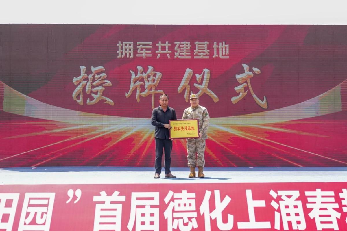 活动中还举行了拥军共建基地授牌仪式。德化县人武部政治工作科科长王书阳为福建省沃沃智慧农旅有限公司负责人欧阳东裕授牌。