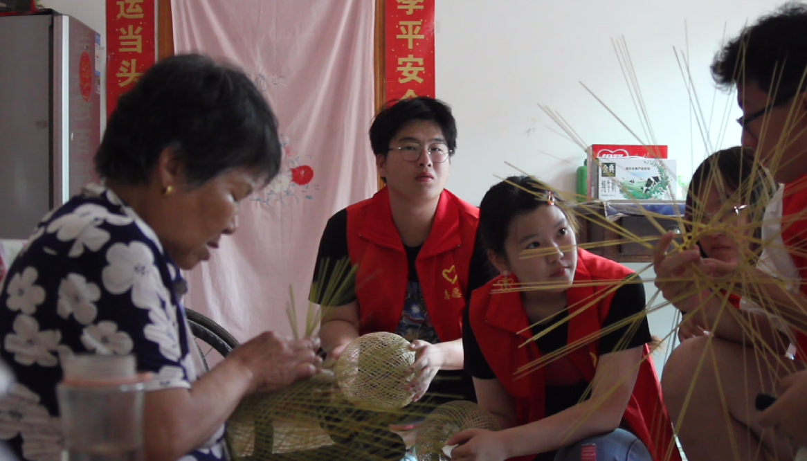 王奶奶现场示范,将竹篾以挑和压的方法构成经纬交织固定,手把手指导着我们进行编织,仔细的向我们讲解每一个动作要领。通过队员们的不断尝试和努力,一件件小巧圆润的竹编作品诞生了!