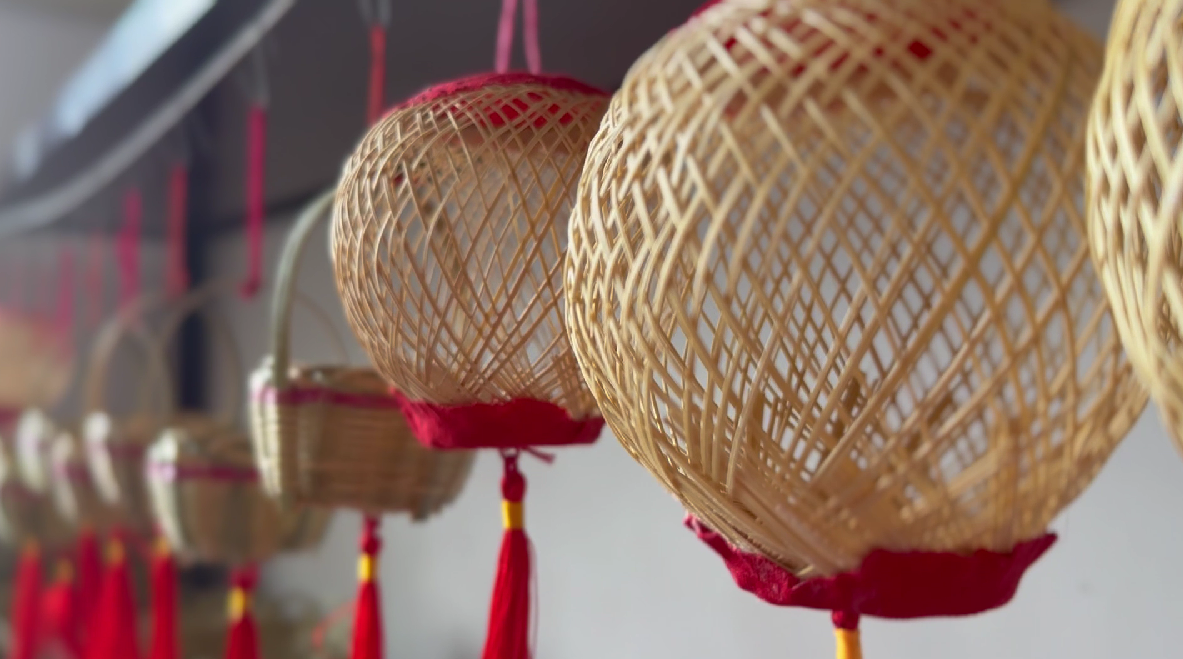 手指一抬一压之间,竹条散发着阵阵清香,传统竹编艺术魅力绽放。灯笼在最后用大红色皱纹纸贴面,只贴中间一部分,两边仍露出细致的竹篾子,点点灯火在竹篾的保护下让整个竹篾灯笼多了一丝温和和风骨。