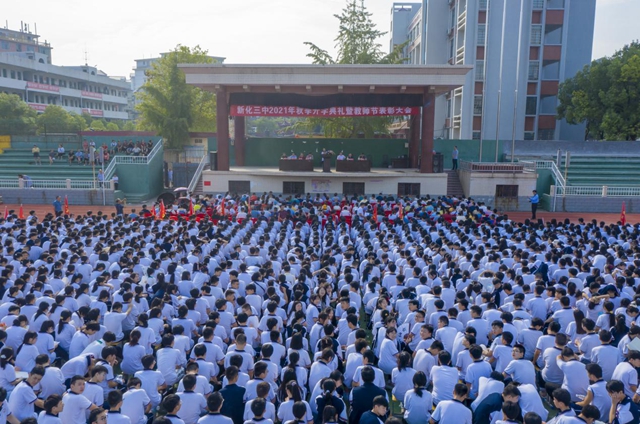 9月10日,新化三中在该校田径场举行2021年秋季开学典礼暨教师节表彰大会。
