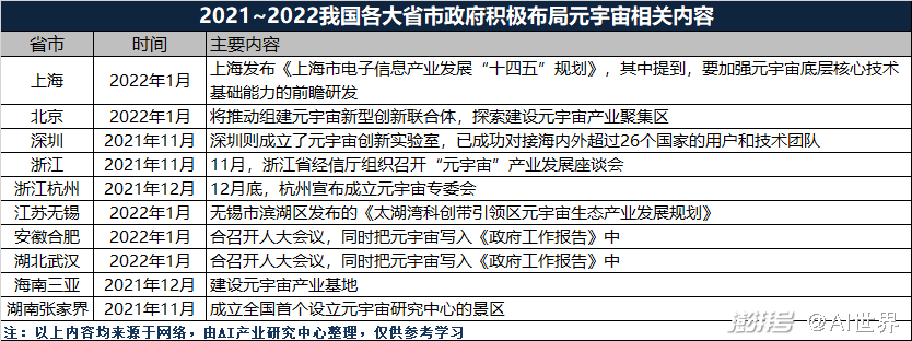 “元宇宙”被写入中国工信部报告,这对全国各地布局元宇宙提供了重要指引。据不完全统计,目前上海、武汉、合肥已将元宇宙写入新一年度地方政府工作报告或产业规划,此前浙江、无锡等省市也在相关产业规划中明确了元宇宙领域的发展方向。
