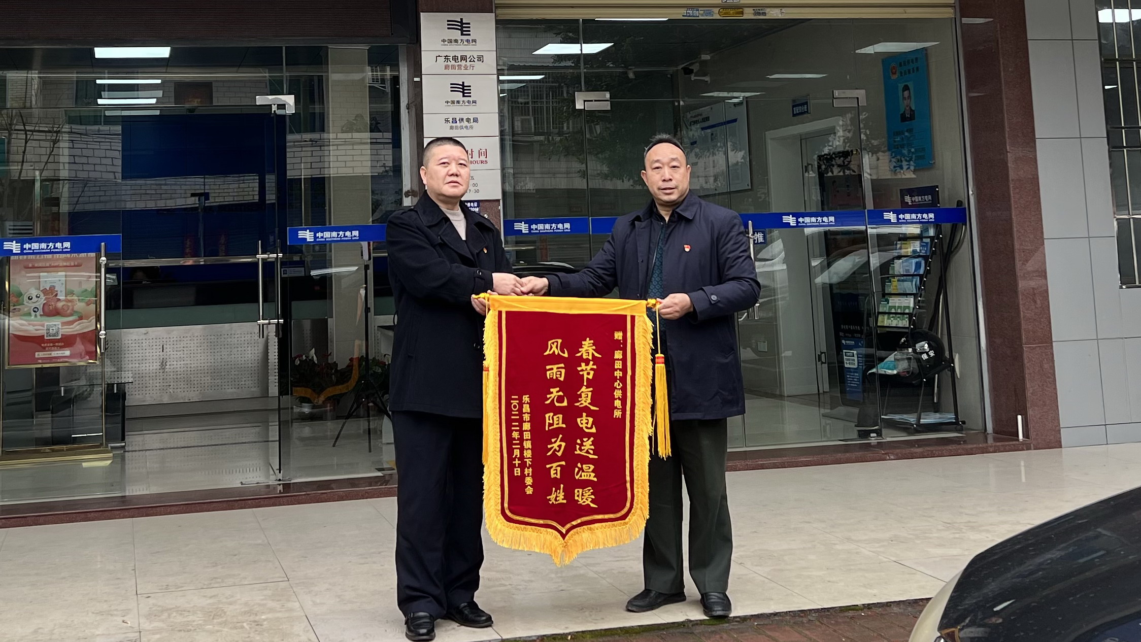 广东刘尉斌稿:“感谢供电所春节期间风雨无阻的保障用电,让我们楼下村的村民们过了一个温暖的好年!”乐昌市廊田镇楼下村党总支书记邓泗洲感动地说道。15日上午,乐昌市廊田镇楼下村委会将一面写着“春节复电送温暖,风雨无阻为百姓”的锦旗送到乐昌供电局廊田供电所,衷心地感谢该所在春节期间高效、热情的服务。