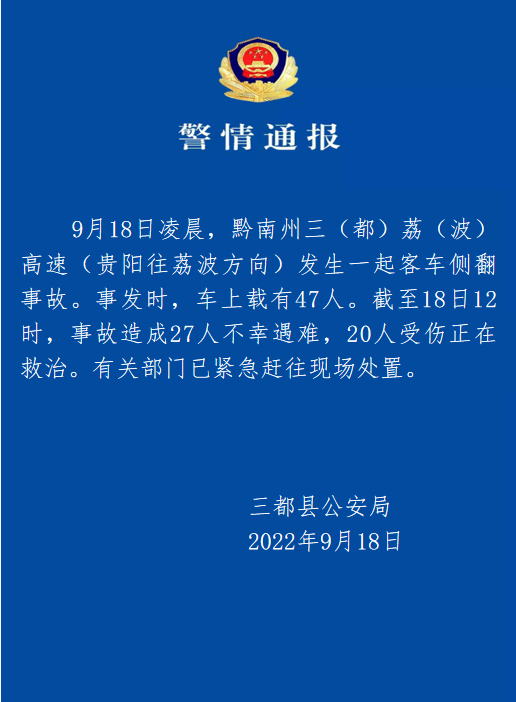 贵州一客车高速侧翻 致27死20伤 记录非遗文化一王玉伦 • 央媒快讯 • 2022-09-18 13:29 央媒头条(记者 王玉伦)贵州消息:贵州三都县公安局发布警情通报称,9月18日凌晨,贵州黔南州一客车发生侧翻,造成27人不幸遇难,20人受伤正在救治。 赞 (1) 分享到: 生成海报 0 全国军地人才科技创新大会将于10月22日在京召开 上一篇 2022-09-18 12:19 义乌市金歌文化传播有限公司—走进凌云公益演出晚会 下一篇 2022-09-19 05:59 相关推荐浪漫诗城 好客山东济宁欢迎您!潍坊职业农民学院2024年新型农业经营主体第二十七期培训班沂源县燕崖镇 年画进景区 新春“景”上添花信息量很大!这部条例为信访工作各环节立“规矩”2024大米杂粮博览会新化县经发集团开展工地安全工作督查庆祝第四个中国人民警察节-暨全国第三十八个110宣传日枣庄奚仲比亚迪王朝4S店三月份产值突破300万创历史新高美丽湖湾 云尚拈花|2022“亲情中华•为你讲故事”江苏网上常规营第三期无锡段滨湖主场即将启幕!浙江省义乌市豫东张某人运输公司-经理张更新