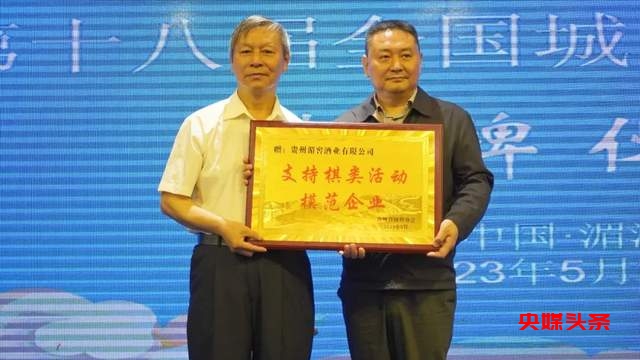 贵州省围棋协会主席王迪苗老师向贵州湄窖酒业有限公司授予“支持棋类活动模范企业”荣誉牌;