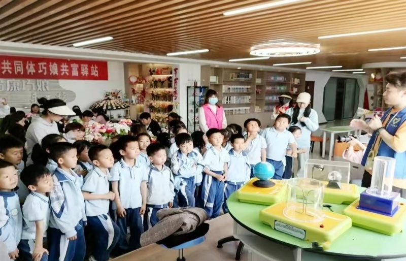 沂源县南麻街道怡康社区志愿者在科普体验馆给孩子们科普物理知识