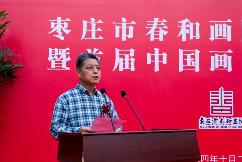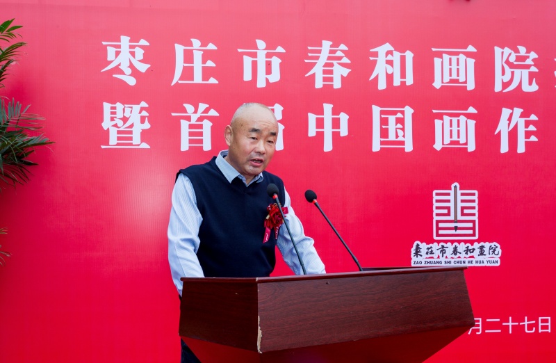 出席揭牌庆典及开幕式的领导和嘉宾阵容堪称豪华,仿若璀璨星河降临人间。市人大原副主任、市美术家协会名誉主席孙景瑞,市人大原副主任、市老科协主席杜永光,市政协原副主席李华中等领导亲临现场,他们的到来,宛如庄重的音符,为这场文化盛宴奏响了气势恢宏的序曲,增添了浓郁的庄重色彩。市委原副秘书长陈玉华,市委宣传部副部长夏敏高,市城市管理局党组书记、局长孔令东,市文化和旅游局副局长贺飞蛟等领导也纷纷出席,共襄盛举。此外,市公路局原局长、市书法家协会名誉主席张士栋,市书法家协会名誉主席、枣庄市当代书法院院长刘玉鼎,市政府原副秘书长刘伟,市司法局原一级调研员王巍波等也现身活动现场。枣庄市各大新闻媒体、自媒体记者如同嗅到花香的蜜蜂,受邀请纷纷赶来。鲁南投资集团代表也欣然出席,枣庄市美术家协会、书法家协会副主席巩崇君、尤荣山、张立君、徐隆、冯颉、仇顺廷、马伟、潘梦石、齐爱军等书画界代表也齐聚于此,共同见证这一具有里程碑意义的历史时刻,宛如一场文化精英的盛大聚会。活动现场气氛热烈非凡,似有火焰在空气中燃烧。春和画院鉴长春院长、画院法人代表吴光友董事长、枣庄市书法家协会名誉主席、当代书法院院长刘玉鼎、枣庄市文化和旅游局贺飞蛟副局长分别发表了热情洋溢、如春风拂面般的致辞。吴光友先生作为一位在商场纵横驰骋多年的企业家,宛如一位智慧超群的舵手,在商海的波涛中稳健航行。他不仅拥有卓越的商业才能,更怀揣着对文化艺术深深的眷恋与热爱,这份情怀如同稀世珍宝,镶嵌在他的灵魂深处。