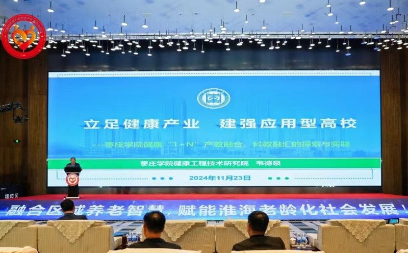 当天下午,以“融合区域养老智慧·赋能淮海老龄化社会发展”为主题的专家论坛成功举行。全国老龄工作委员会第一届专家委员会委员、全国养老服务专家委员会副主任委员党俊武等六位专家受邀作专题报告。山东煤炭卫生学校名誉校长、枣庄学院健康工程技术研究院韦德泉教授发表了题为《立足健康产业,建强应用型高校》的报告。