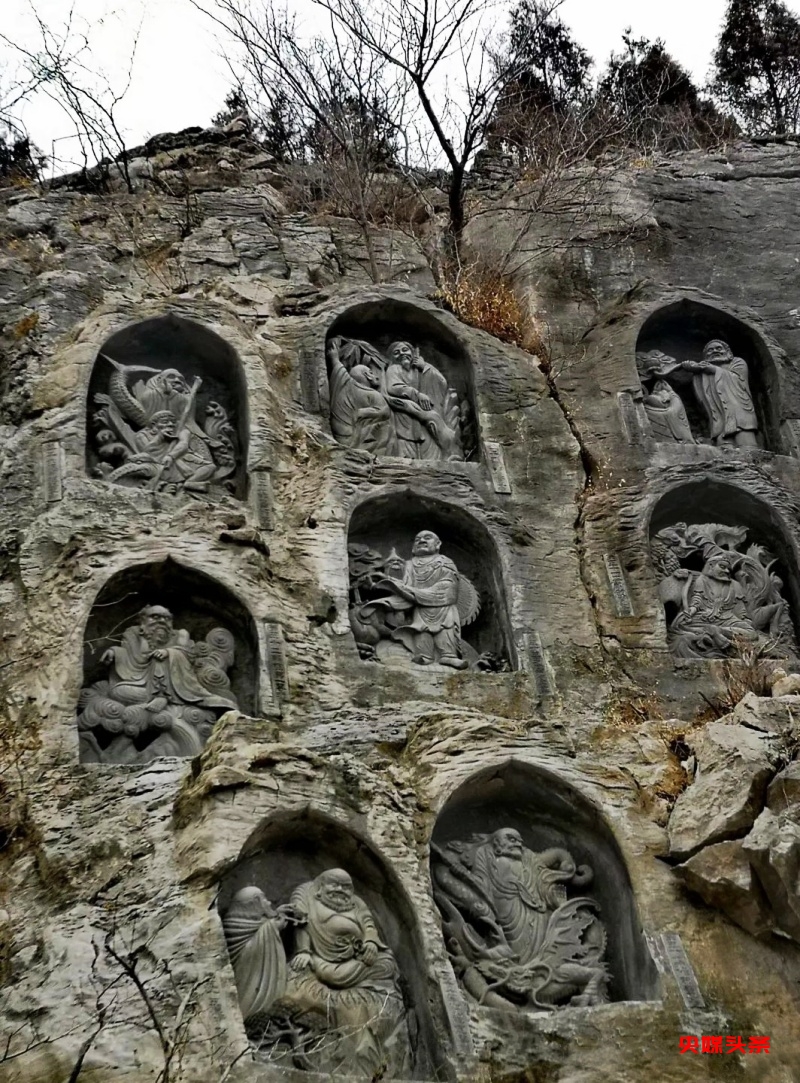 唐山寺东南百米处,悬崖峭壁把山峰围砌成崮的形状,这里便是著名的罗汉崖。隋唐时期人工造罗汉石像503尊,称“五百罗汉”。因风吹雨打和人为因素,面部均遭破坏,其余部分大致完好,身披架裟的罗汉造型,栩栩如生,无不慨叹当年能工巧匠们巧夺天工之艺术。全国政协原副主席、中国佛教协会会长、著名书法家赵朴初先生的名作“五百罗汉”,镌刻于崖壁,进一步宣染了罗汉崖的氛围和知名度。为使人们能在罗汉崖看到完整的罗汉像,随着机刻技术的发展,2006年,一徐姓有缘人,出资在此处刻制了百余尊罗汉像,每尊像刻有罗汉的名字,大大提升了罗汉崖的观赏度。同时还在唐山西侧石壁雕刻上了百幅巨龙,龙图腾造型大气磅礴、气势恢宏,国内罕见,使唐山文化底蕴更具魅力。前几年,山西南侧打造“花开问禅”旅游项目,在山顶悬崖醒目处,镌刻了一个大大的“禅”字,让唐山寺禅味更足!