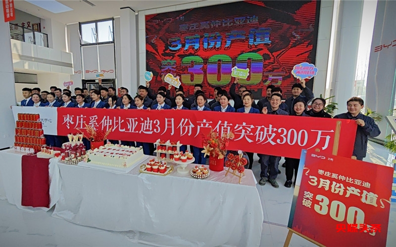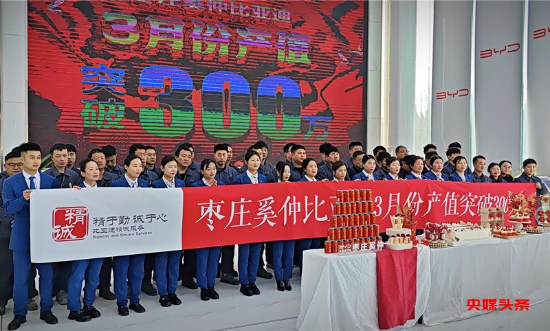 央媒头条山东枣庄讯(王海涛 图文/鲁新喜)4月1日,山东枣庄奚仲比亚迪王朝4S店传来特大喜讯,三月份产值成功突破300万,实际完成302万,创造了历史新高。这一优异成绩不仅展现了该店强大的市场竞争力,也为枣庄汽车销售服务行业树立了新的标杆。