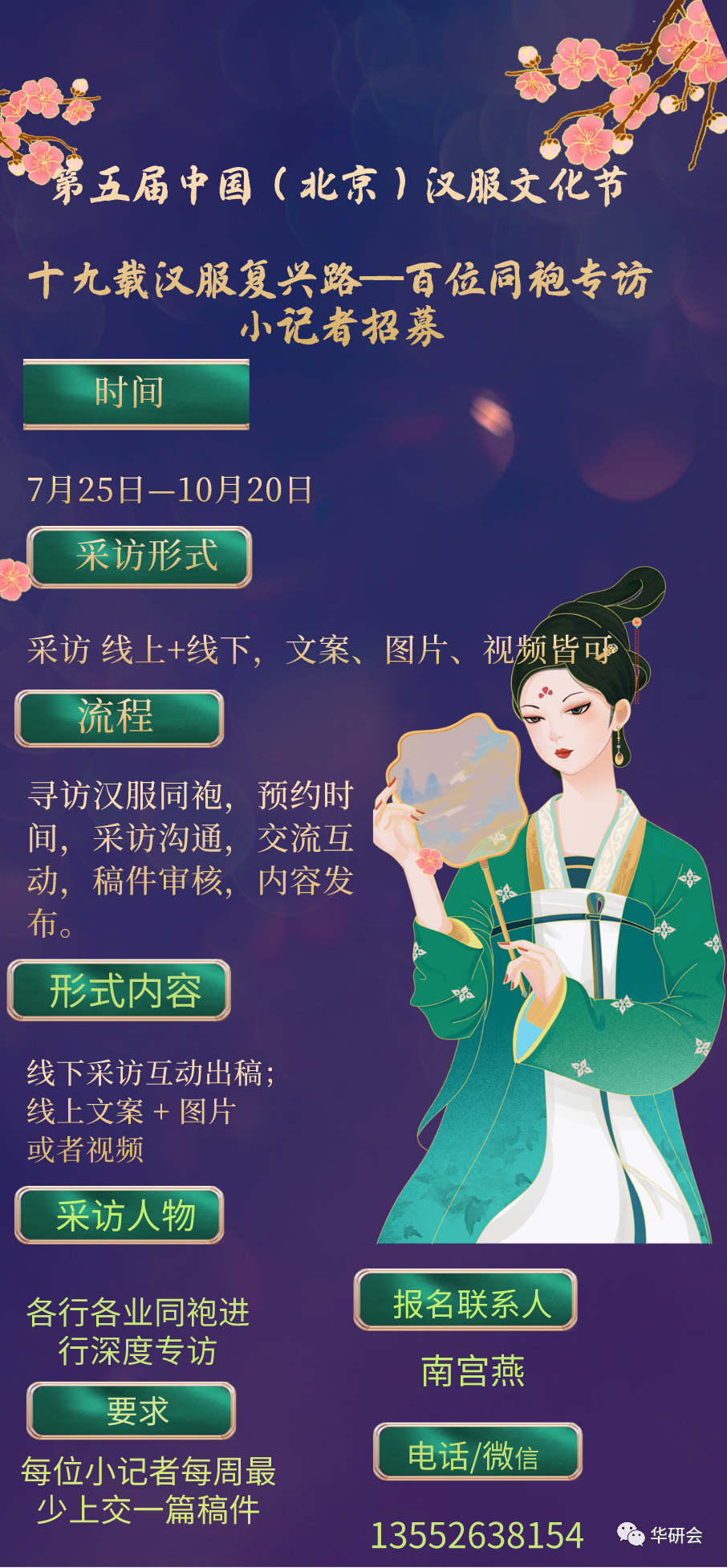 2022年,汉服运动十九周年,又正值第五届中国(北京)汉服文化节即将开幕之际,华研会小记者团借此平台和时机寻找100位活跃在各行各业的平凡的同袍,他们或许没有明星那么耀眼,也不是人尽皆知的英雄,他们都是最平凡的年轻人。本次专访栏目的目的和初衷就是让这些同袍从幕后走到台前,但是并不是要让他们成为明星,而是听他们讲述那些最质朴,最纯真的故事。用小记者独特的视角,通过座谈、视频等方式讲述自己与汉服的那些或悲或喜的故事。那些年一起哭过、笑过、感动过。一起经历过的最美的时光。无论岁月如何变迁,那份质朴纯真的心将永远不会改变。专访形式: