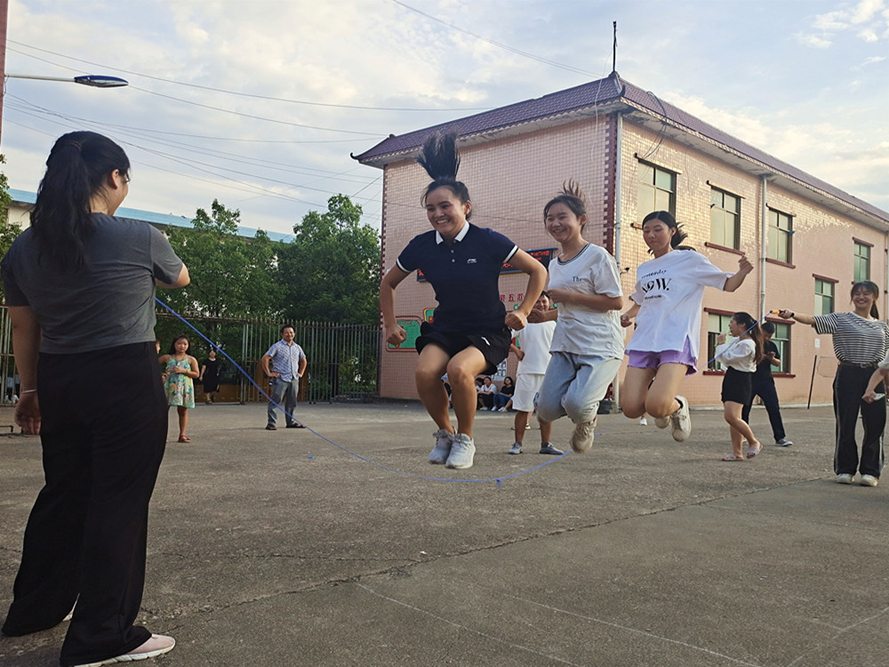 在跳绳活动中,老师们在飞舞的彩绳下跳来跳去,轻盈如燕,灵活敏捷,助威观战的老师也都兴致勃勃、欢呼雀跃,比赛场面精彩纷呈,妙趣横生。