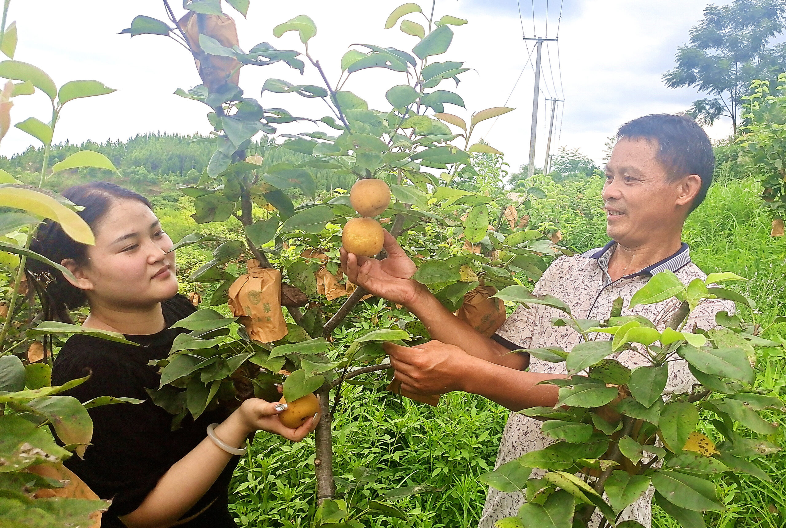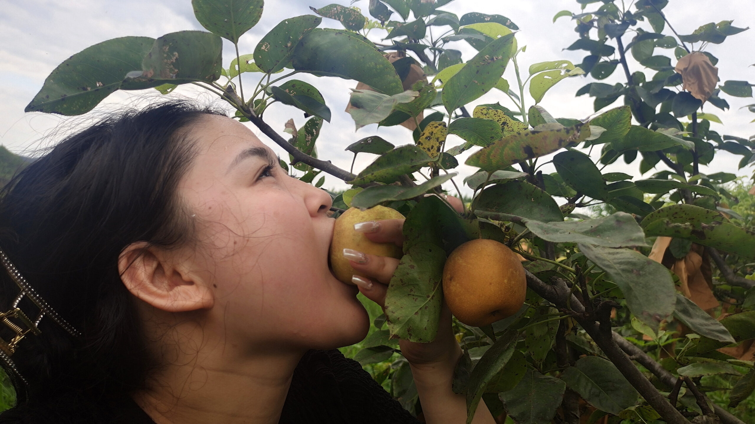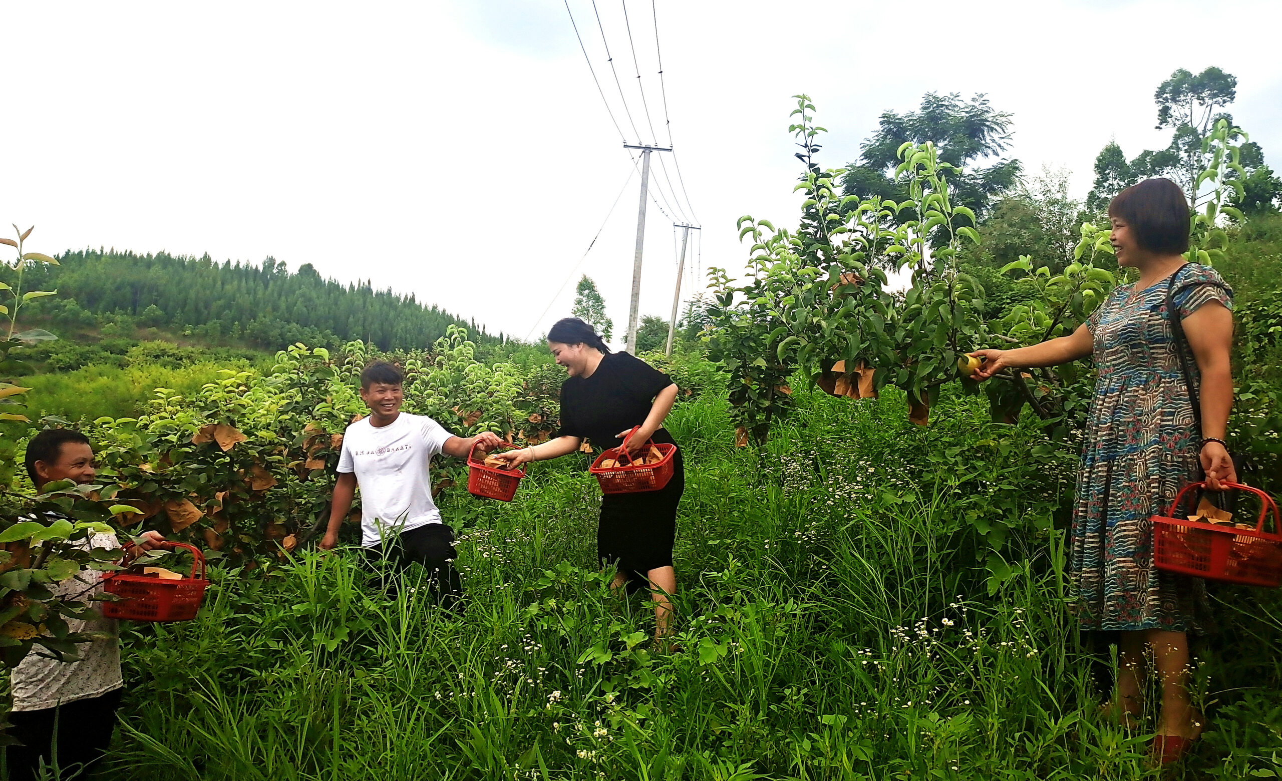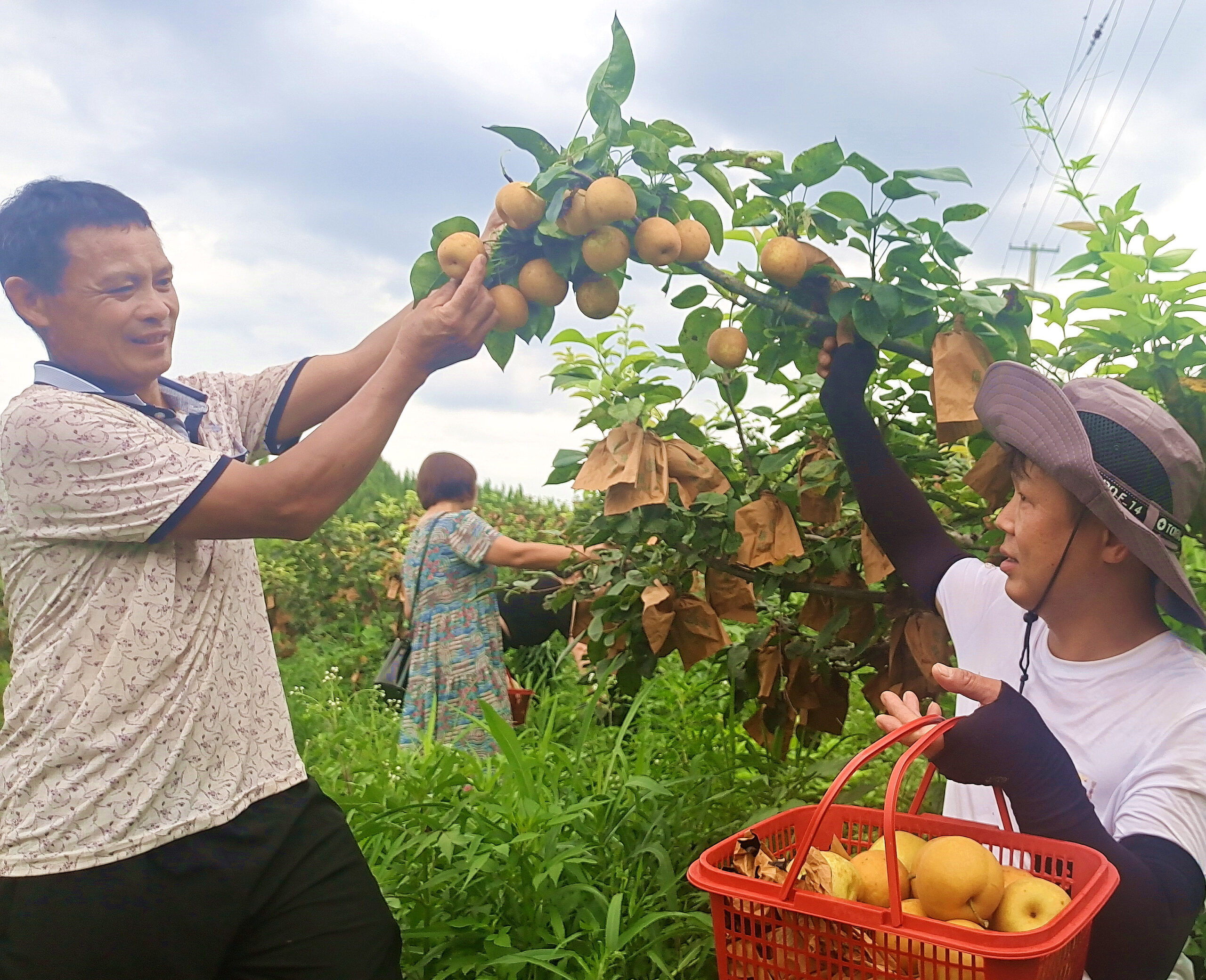 7月8日,新田县新隆镇野乐村村民谢桐保的80亩富硒果木基地,六月雪梨成熟了,游客和本地村民冒着酷暑走进梨园,选梨、摘梨体验采摘乐趣。