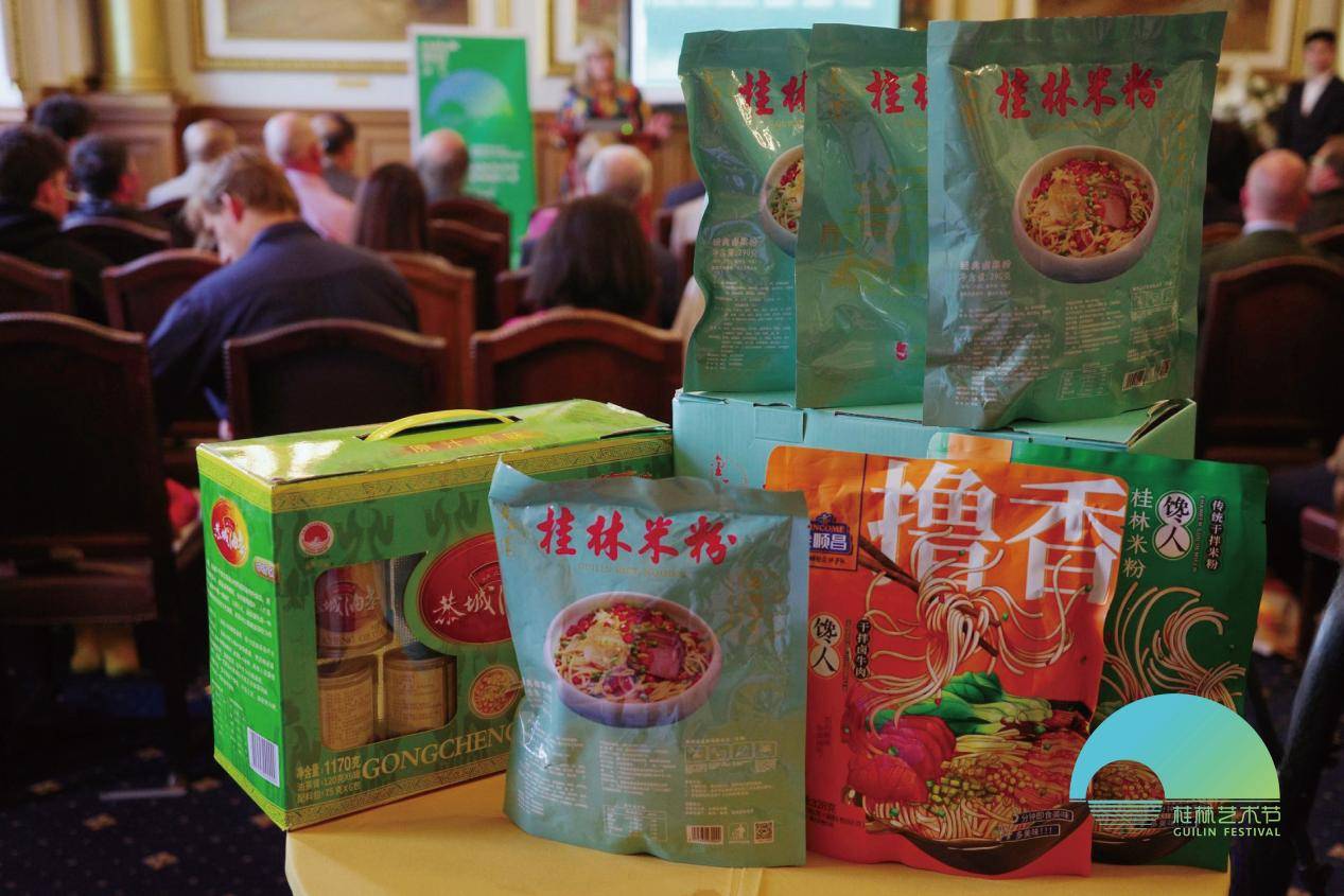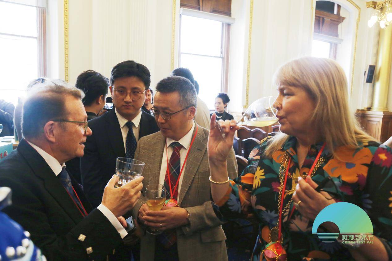 在极具苏格兰民族特色的风笛迎宾乐曲声中嘉宾纷纷进入会场,在推介会开始的欢迎酒会上,新桂林三宝——桂花酒、油茶、米粉,桂林艺术节特色文创等亮相会场,吸引了众多中外嘉宾的目光,大家纷纷驻足了解相关特色内容,品尝桂林美味,同时产生了对于桂林的向往之情。爱丁堡以威士忌闻名世界,桂林的桂花酒与威士忌也来了一次跨越国界的相逢。