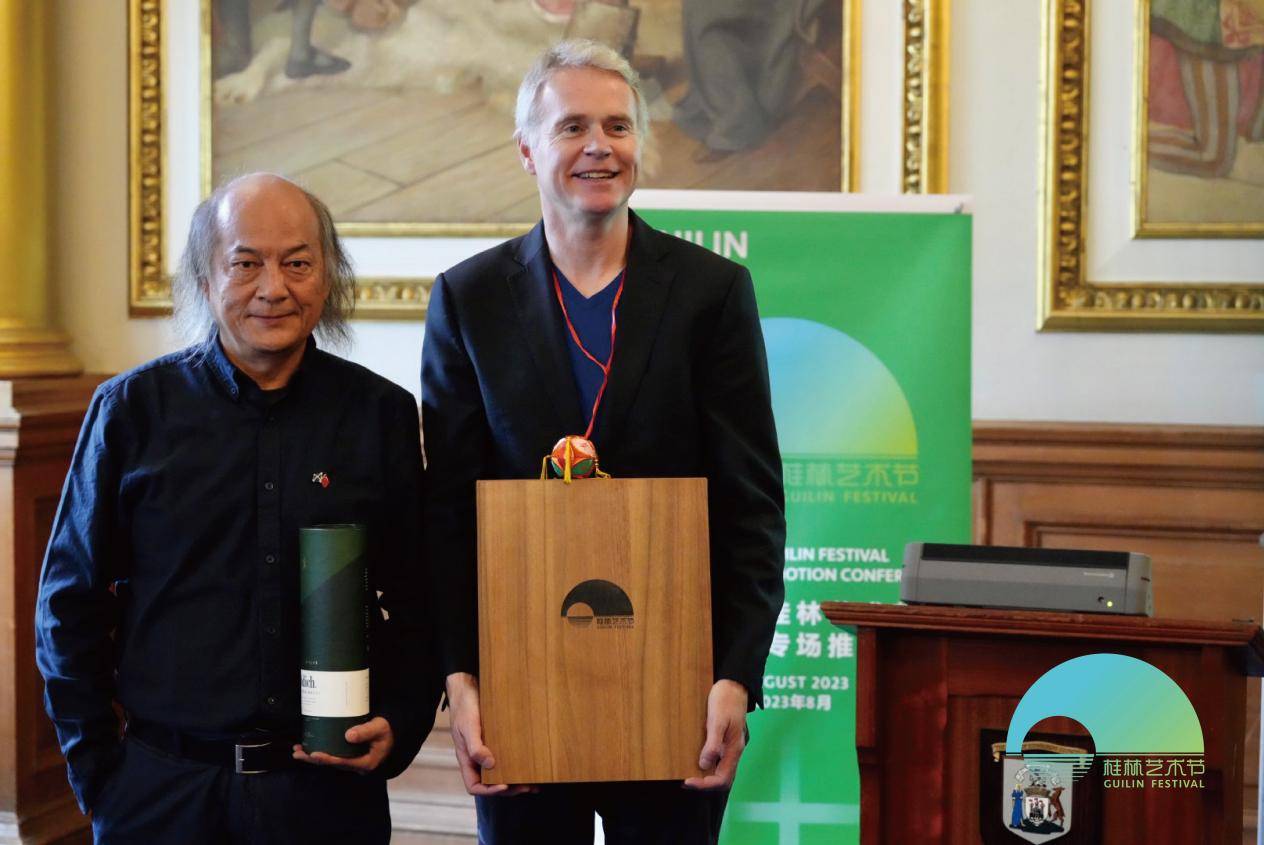 此次专场推介会正逢爱丁堡国际艺术节期间,为桂林艺术节提供了更大的影响力和曝光度。爱丁堡国际艺术节创立于1947年,已有76年历史,是享誉世界的顶级艺术盛会。苏格兰亚洲艺术基金会董事会主席、爱丁堡艺术节委员会前主席、爱丁堡议会文化委员会主席理查德·路易斯先生在本次推介会上致辞,对中国戏剧风采与桂林艺术节魅力赞不绝口,同时欢迎更多中国艺术家和优秀戏剧作品在未来相聚爱丁堡。桂林艺术节艺术总监、中央戏剧学院教授刘杏林教授与理查德先生进行了互换礼物。