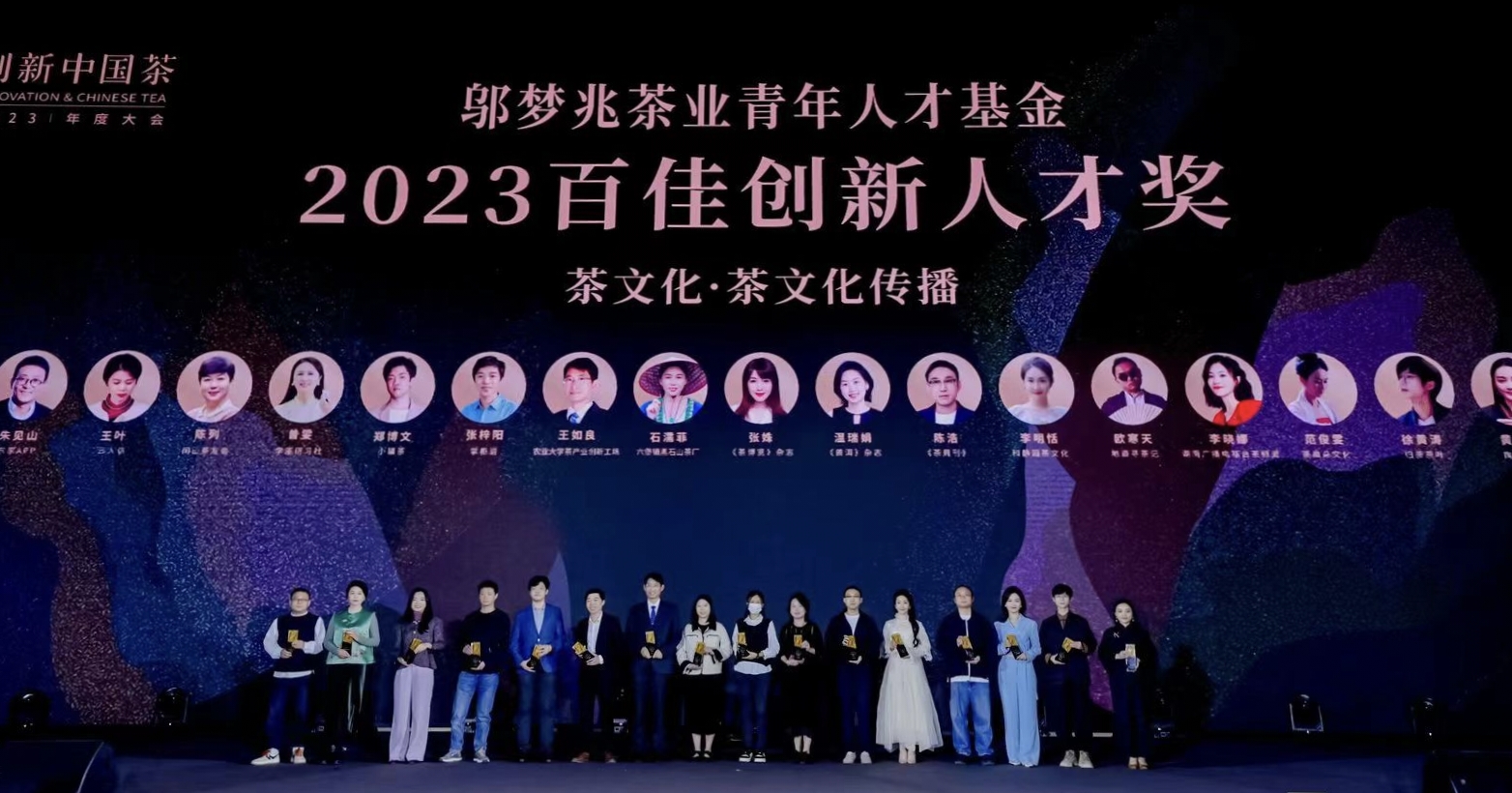 本届广州茶博会欢迎晚宴上,汇聚了中外行业精英1500人,举行了创新中国茶2023年度大会“百佳创新人才”颁奖典礼,作为本次大会的重要环节,100位奋斗在中国茶产业各领域的新生力量荣获“创新人才奖”。奖项涵盖茶文化、茶产业、茶科技三个领域。其中,茶文化组别涵盖茶文化创作、茶文化教育、茶文化传播和茶文化旅游等方面44人;茶产业组别涵盖茶企经营管理、茶产品研发和茶空间主理等方面38人;茶科技组别涵盖植茶科技、制茶科技和饮茶科技等方面18人。第二天,300名青年茶人开展对话,这次茶行业最充满活力的一次思想碰撞。