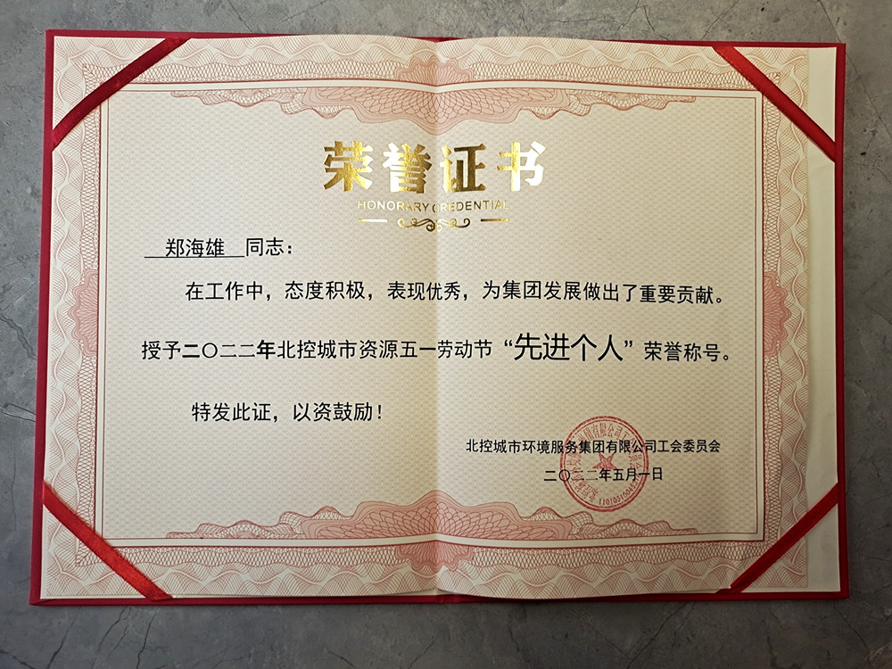一份汗水、一份收获。几年来,郑海雄先后获得县环卫工作“优秀乡镇主管”4次;今年,五一劳动节他被授予北控城市资源“先进个人”荣誉称号。(文/图 通讯员 何新瑞 邓仕明)