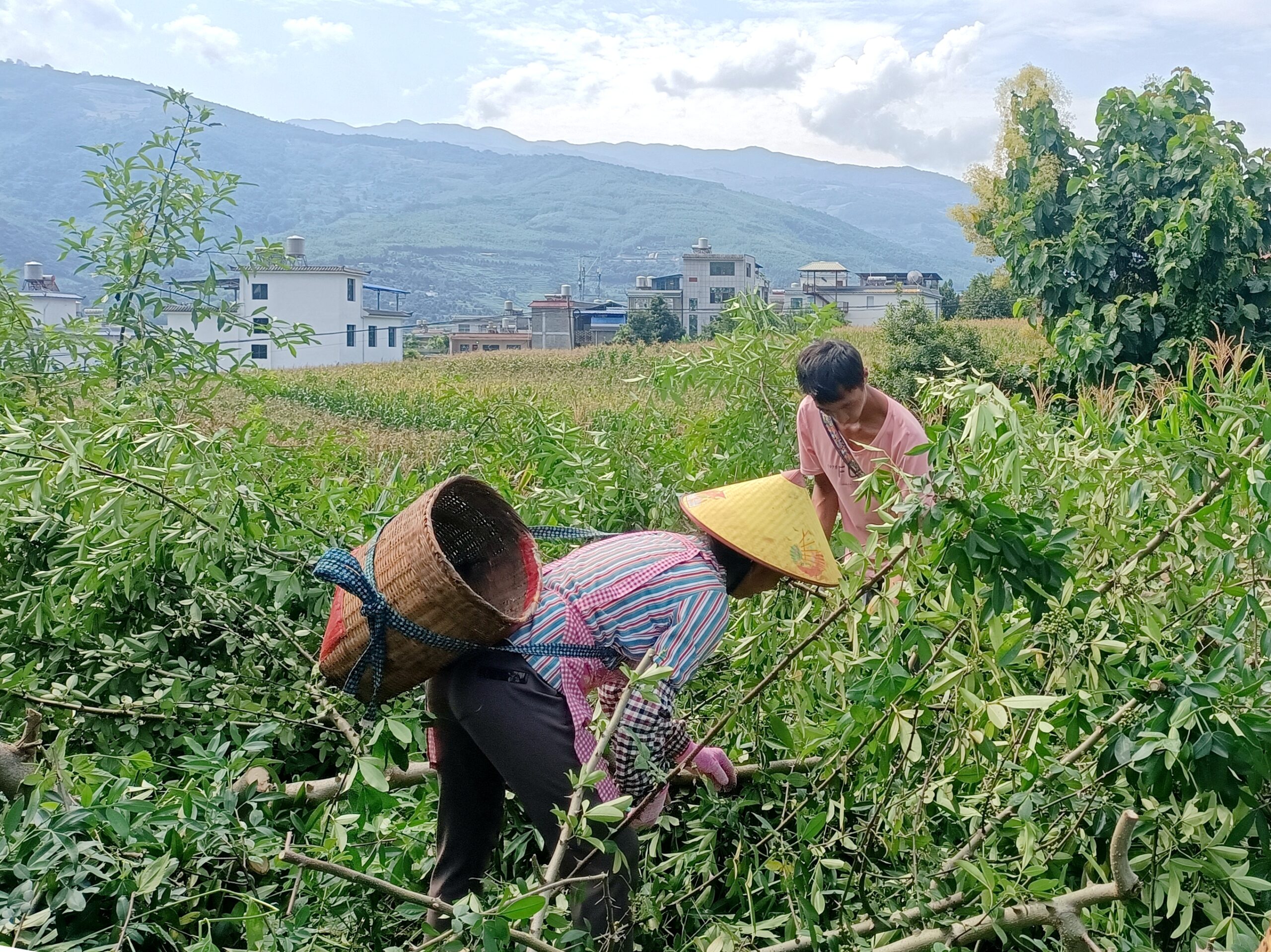 在临沧市云县幸福村上新村组的藤椒基地,放眼望去,到处是一片绿油油的藤椒树,微风拂过,空气中弥漫着藤椒特有的椒香。藤椒树上,挂满了粒粒饱满油亮的藤椒。果实压枝的成片椒林下,工人们在藤椒地里忙碌着,他们戴着厚厚的手套,用剪刀剪下硕果累累的枝条,剪枝、去叶、剥离、小心翼翼地放在竹箩里,动作一气呵成。