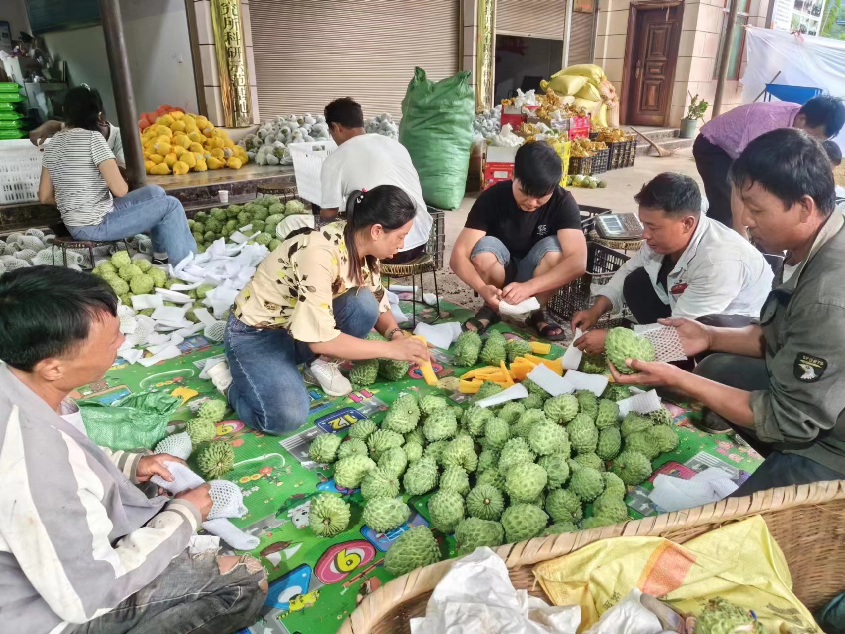 连日来,番荔枝种植区的社员们上午采摘,下午售卖,忙得不亦乐乎。合作社院内一片繁忙热闹的场景,社员将采摘到的番荔枝用三轮车、微型车运送到合作社进行清理、分拣、包装、装箱、称重、交售,满脸透着丰收的喜悦。