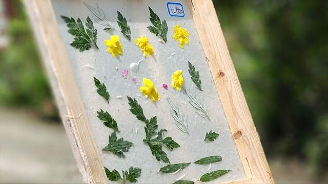 学习中,学生们用传统的工具,完成了一张“皮纸”。随后,潘老师带着学生们一起体验手工造纸。潘老师一边演示,一边介绍每一道工序,并将每一道工序中的工具、材料等一一做了详细介绍。学生们通过在潘老师家中学习手工造纸技艺,对传统手工造纸有了更深刻的认识。