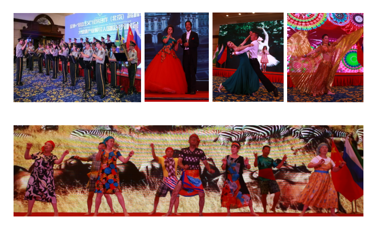 会议期间,组委会还特地安排了反映金砖五国的文艺节目。特邀央视主持人杨央在分别介绍金砖五国风情的同时,艺术家们先后以演唱、演奏和舞蹈等形式表演了二重唱《我爱你中国》《莫斯科郊外的晚上》、巴西舞蹈《激情桑巴》和印度风情独舞《热情的玫瑰》以及反映南非土著民族风情的《狩猎舞》,以及花腔女高音独唱《春天的芭蕾》等节目,使会场激情飞扬,引得嘉宾们纷纷拍照和鼓掌。