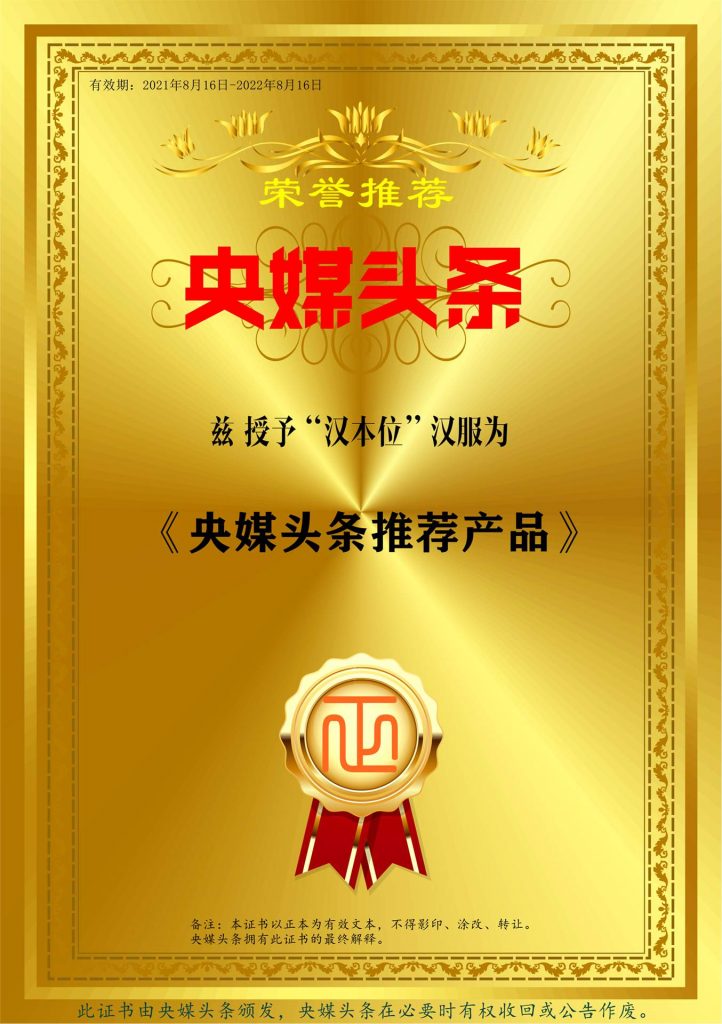 经中国第一排行榜品牌“天机排行榜”推荐,“汉本位”汉服被央媒头条授予《央媒头条推荐产品》证书,这是中国汉服品牌中首个获此殊荣的汉服品牌,足见“汉本位”汉服的文化内涵及设计思路、产品制作工艺是经得起汉服同袍们的鉴证的。