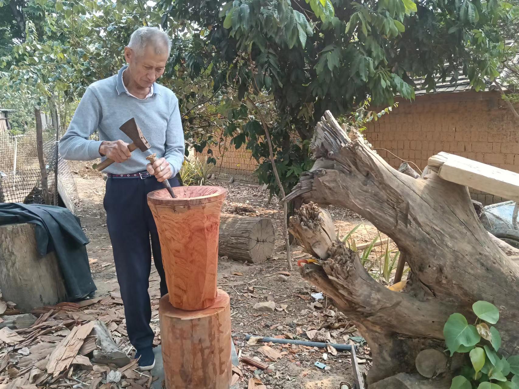 后来,他了解到,家乡会制作象脚鼓的人越来越少;随着时间的流逝,很多好的技艺逐渐失传了。于是,2016年,他选择回到老家,踏踏实实地跟爷爷学习做象脚鼓的窍门。很多时候,爷爷还是让他从最初的凿鼓心开始。