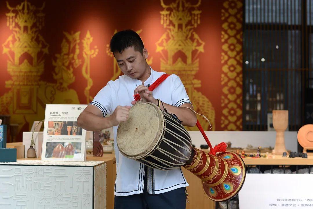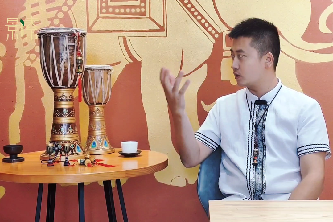 象脚鼓和金水漏印都是傣族的非遗技术,谢文平将两种非遗巧妙地融合在一起。一个产品两种传承,并且很好地将它产品化和现代化。