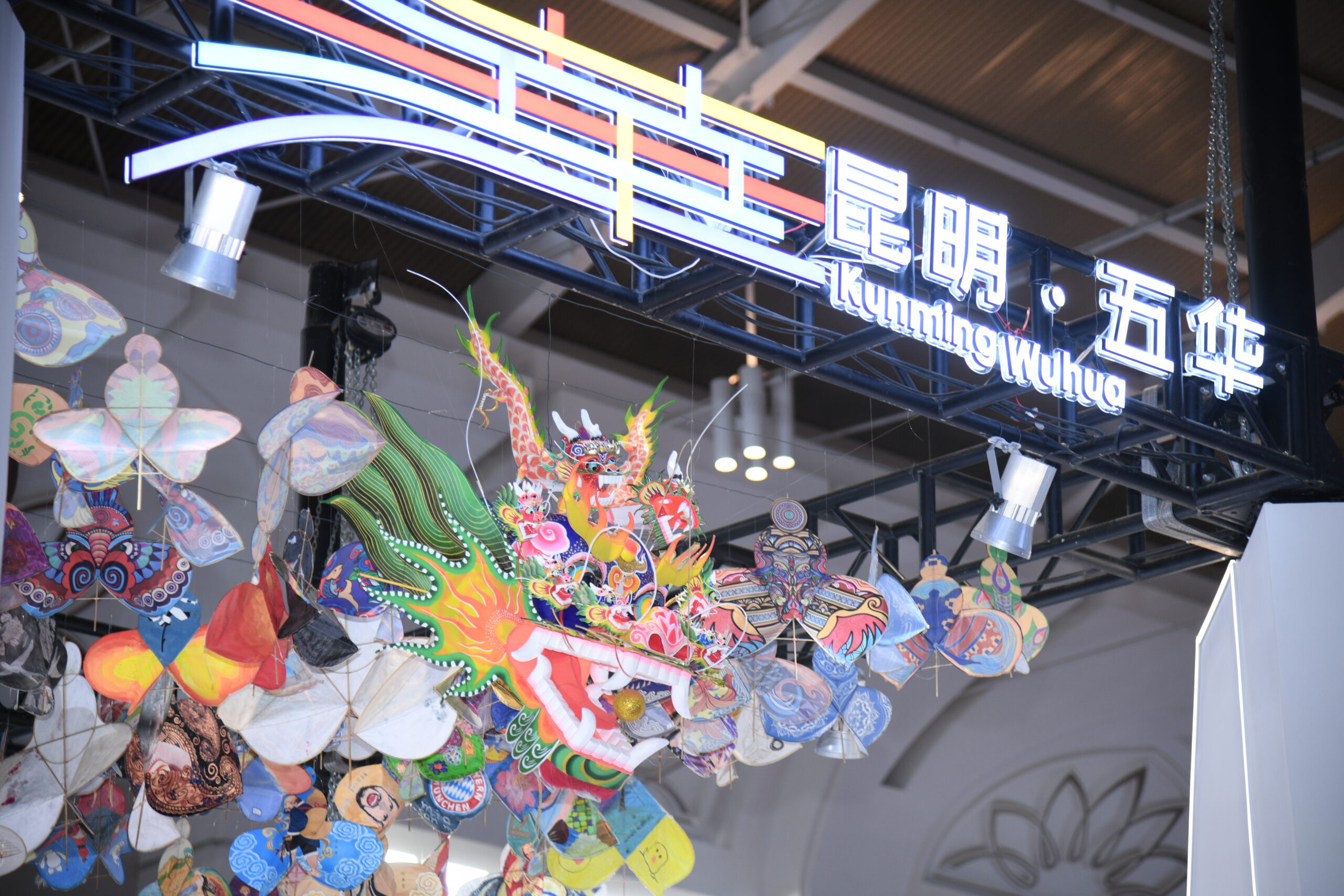 从五华展区上空,漂浮的滇式风筝五彩斑斓,据了解,五华区的滇式风筝制作技艺已有600多年的传承历史,是全国唯一具有“高原”飞行特点和历史文化传承的风筝,无论是从色彩、结构,还是从制作手法上,都独具滇派韵味,成为独树一帜的文化艺术形式。