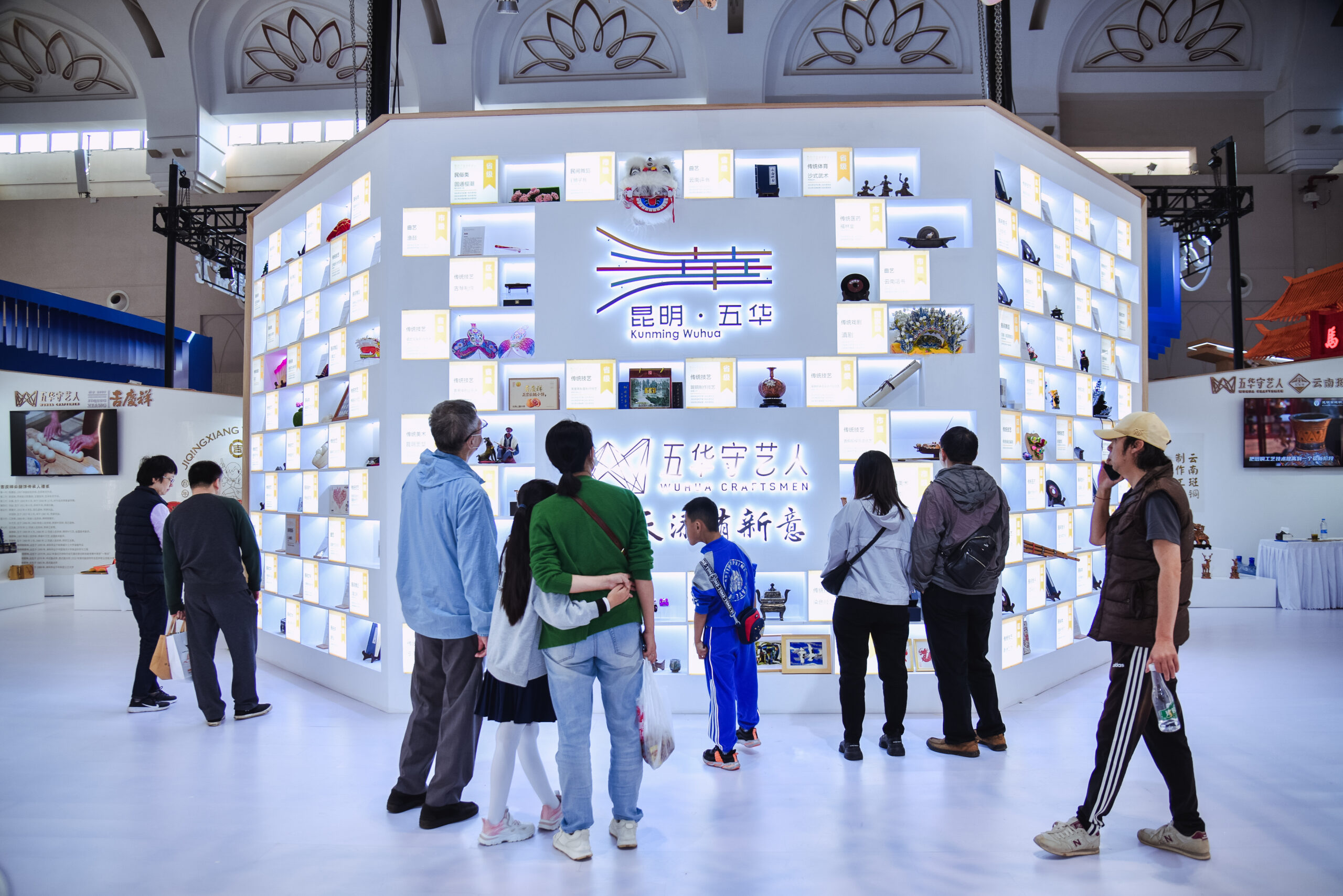 展区内各项非遗技艺精品也同样让人赞不绝口。昆明市五华区非遗面塑传承人马菊、史亚鑫展出了十余件面塑作品,以精湛的指尖技艺,将各种人物形态、动物形象表现得栩栩如生。