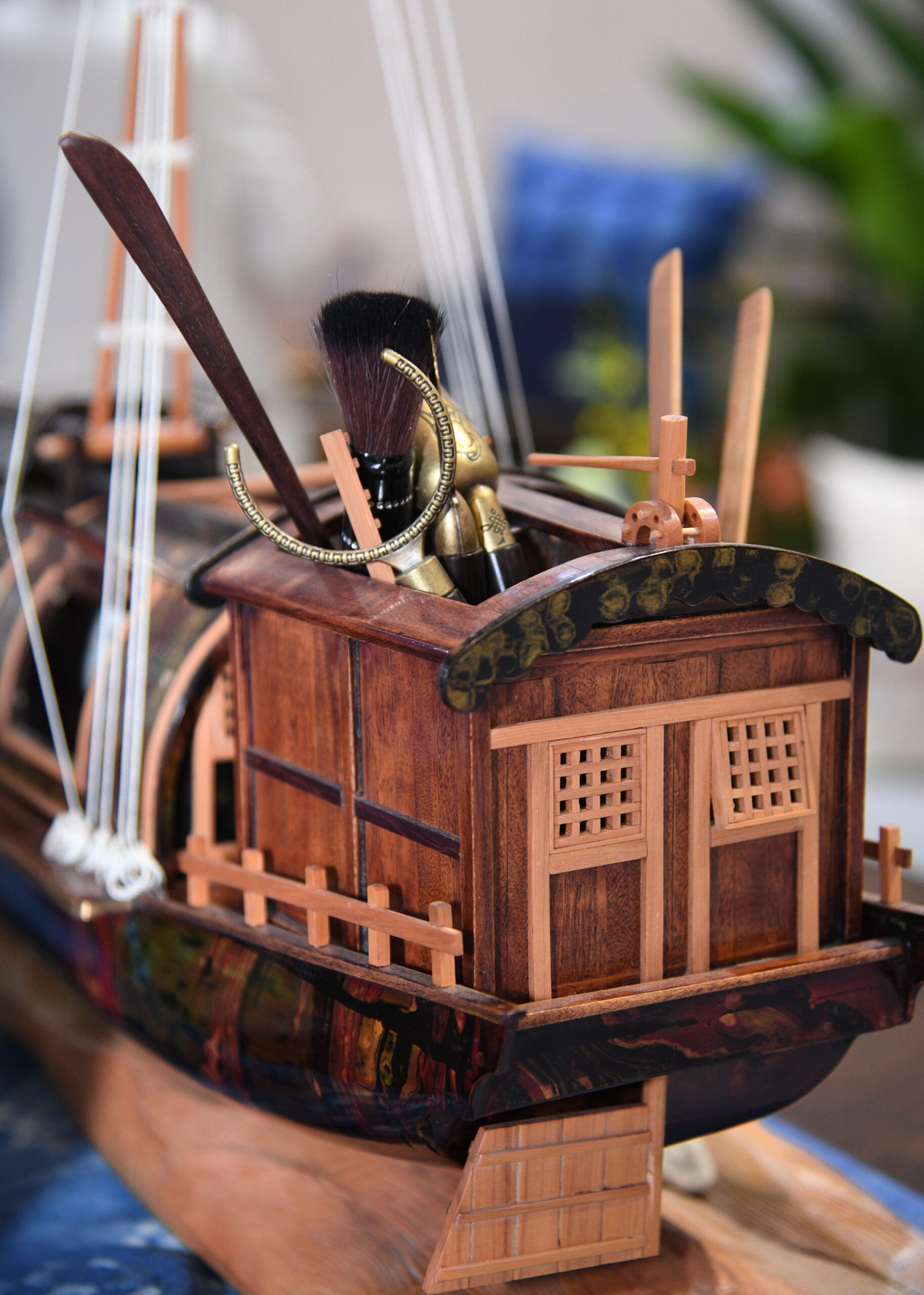 展区现场,“古船说”带来的古船船模营造技艺也十分震撼,一搜搜等比还原的船模,精致呈现了古船的细节,古船船模营造技艺非物质文化代表性传承人付昆祥老师介绍道,“古时造船是现有船模,再等比放大造船,古船船模营造技艺便由此而来,至今也有两千多年的历史,制作一条船模,按步骤细分下来,得有上千道工序”。在付老师及其工作室手工艺匠人的创新下,如今的船模还兼具了很多实用性功能,在展区展出的一艘茶船,便是将船模制作成了茶具,给了这项非遗技艺更加广阔的应用场景。