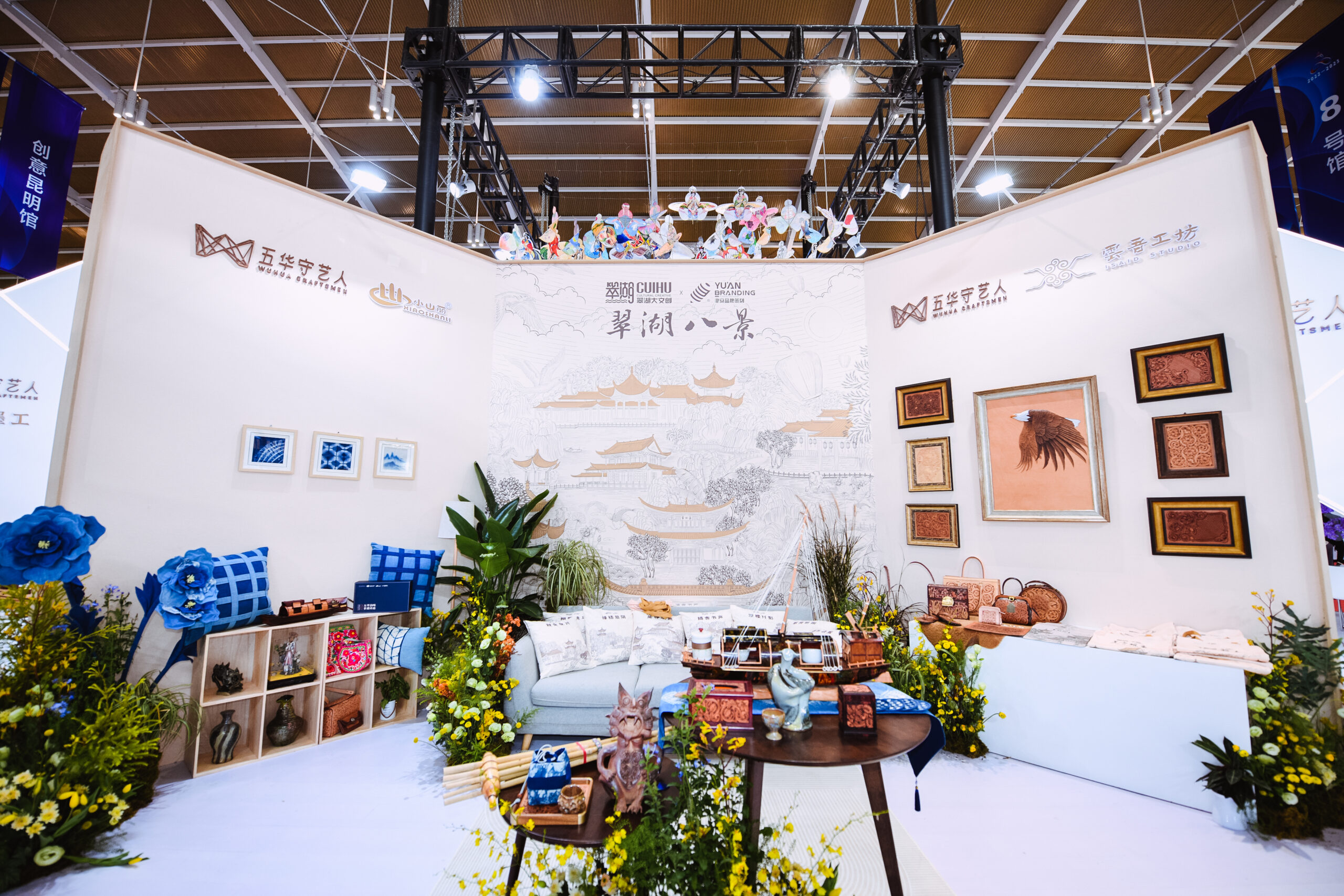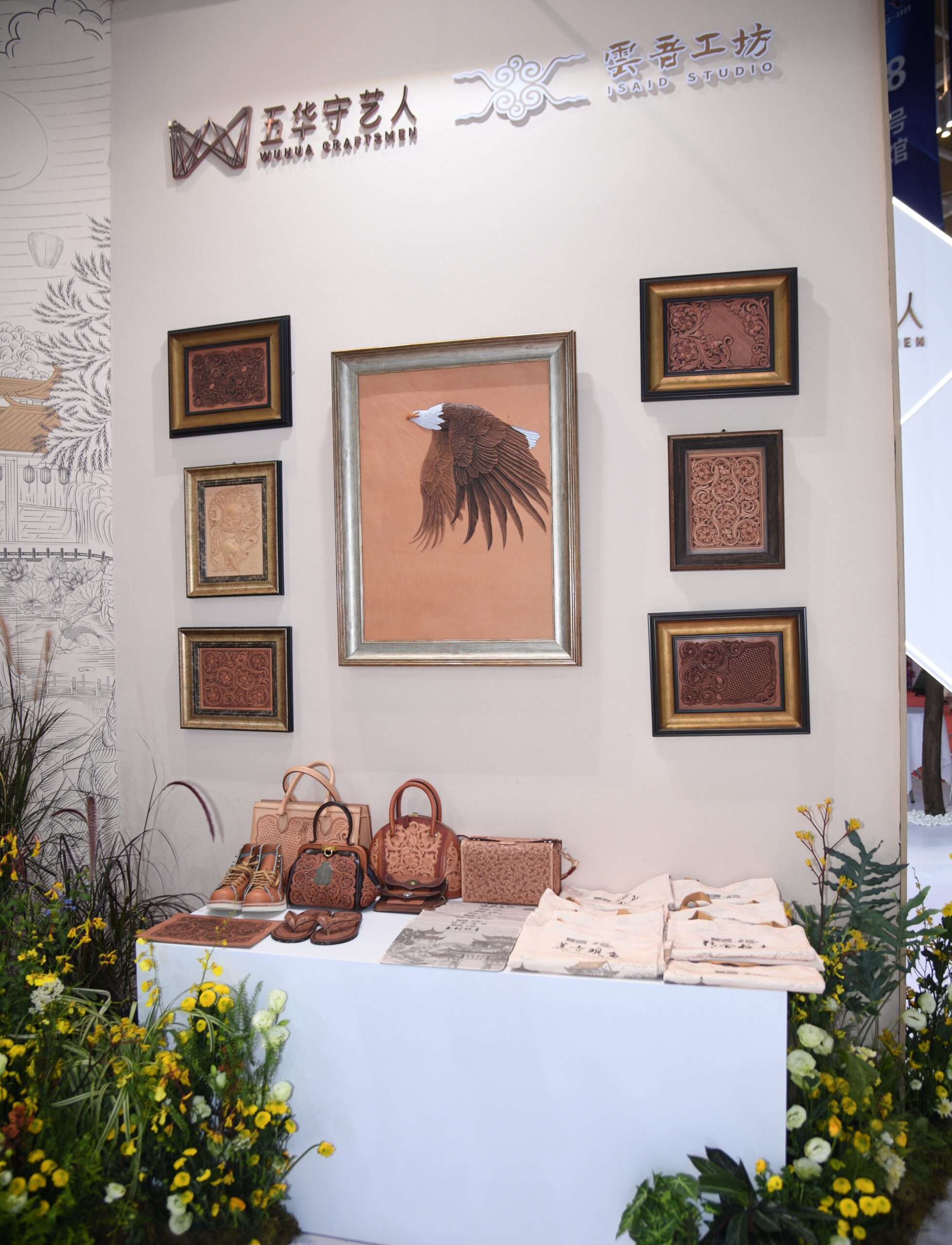 在五华展区,非遗技艺与现代生活的融合也十分巧妙。在一个生活场景中,由聿安品牌策划(云南)有限公司创作的翠湖八景作为主背景、系列文创成为家居生活的日常;小山丽民族品牌的染色技艺挂画、装饰花也是生活的一部分,云吾工坊的皮雕挂画、皮具、皮鞋、皮包等,高氏皮雕的纸巾盒,古船模制式的茶台茶具等,非遗的技艺深入到生活的每一个角落,真正传达出非遗场景的融合创新,走进生活、融入生活,为生活“天添”新意。