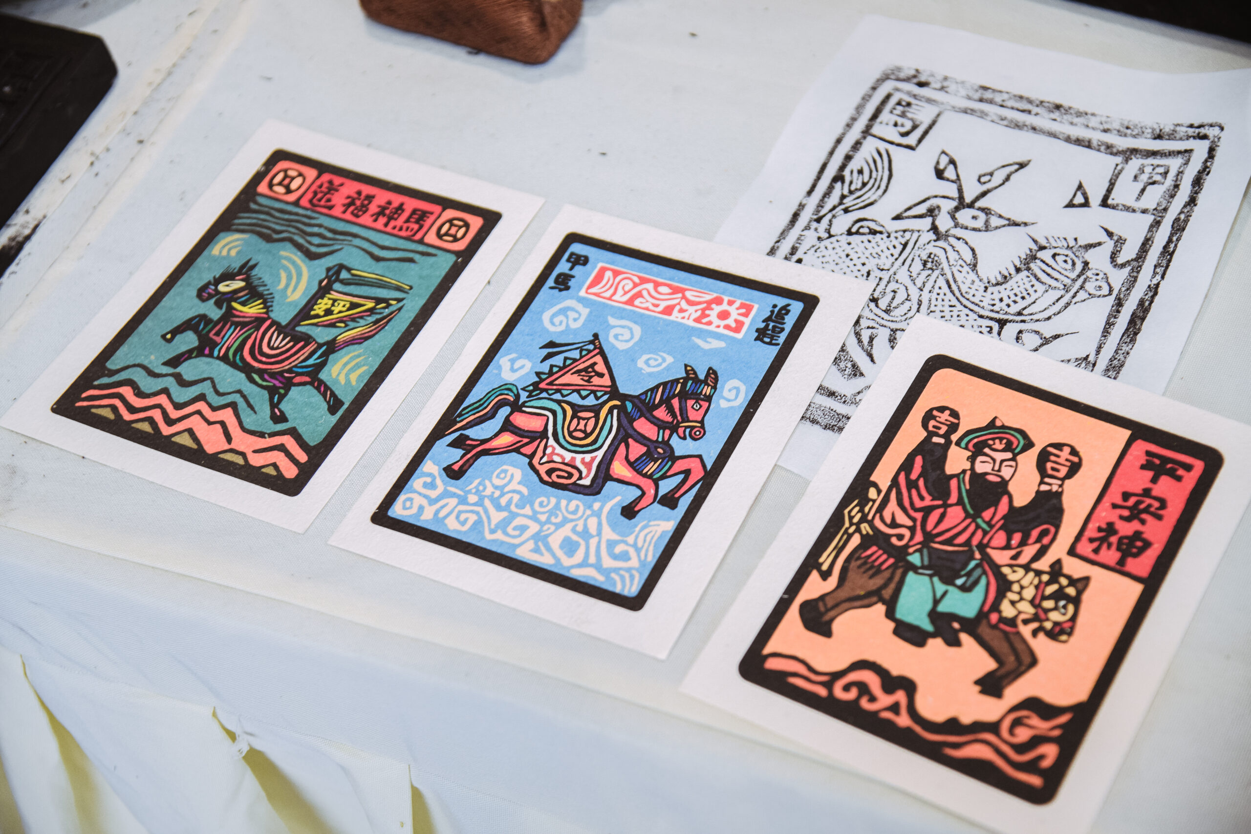 甲马是一种具有神秘色彩的民间木刻版雕,在阴阳刻线的木板中,以简洁粗放、虚实变化的线条感表现出了祈求平安、招财祈福等主题内容,是一种古老的民间艺术形式,如今在五华沙朗地区仍延续着这一民俗艺术。据了解,沙朗文创园为将这一技艺传承下去,结合现代审美,以白族甲马为艺术载体,进行了创新,开发了甲马藏书票等非遗文创。