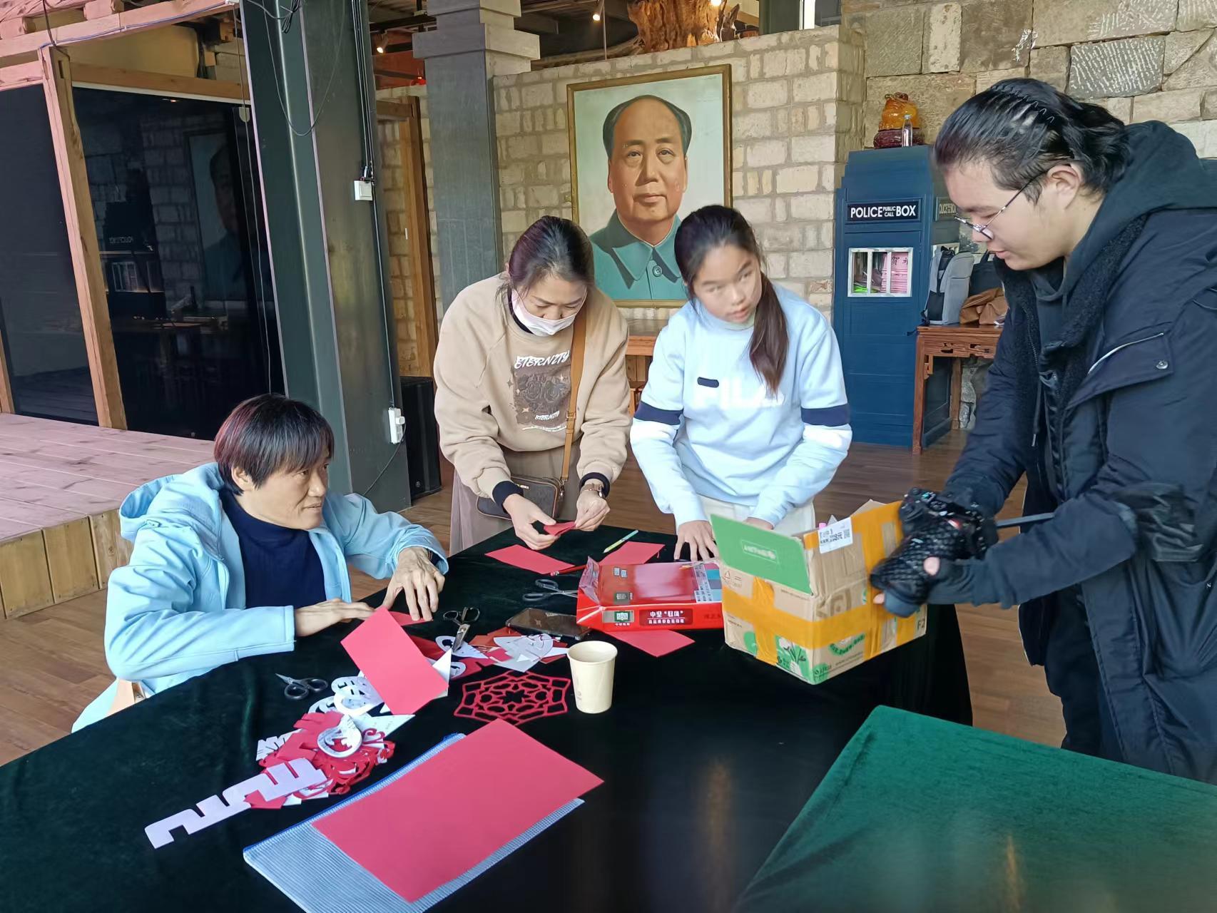 目光荡开,下午的村史馆里,逐渐人头攒动。这里,也是官渡街道第四届文化艺术节的分会场,官渡区农民画非遗传承人李水仙已经在案前坐下来,摆开了一些剪纸工具。一些社区居民和孩子围拢在她身边,抢着跟她学剪纸。