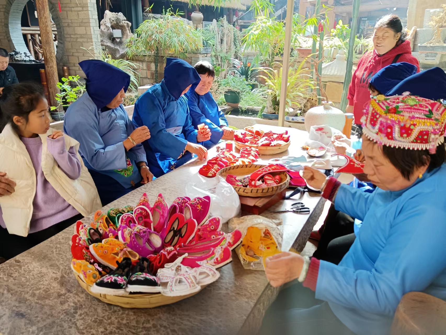 村史馆门口的桌子前,一些社区的老奶奶,穿着彝族服装,在一针一线地绣着虎头鞋和绣片。一针一线里的传承,引来了很多居民的围观和赞叹。