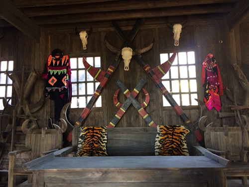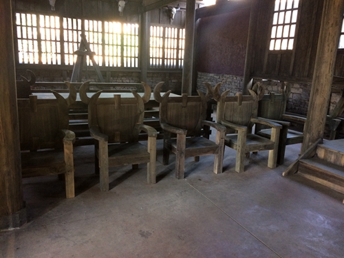 屋里的所有梁柱和桌椅都没有上漆,保持着本质的木色。历经岁月的沧桑,古朴之中愈发显得厚重。沉重的桌子后面,是宽大的类似历代帝王的榻状的坐具,坐具上的两张虎皮虽然是仿制的,但也显示着当年的佤王位置之尊。