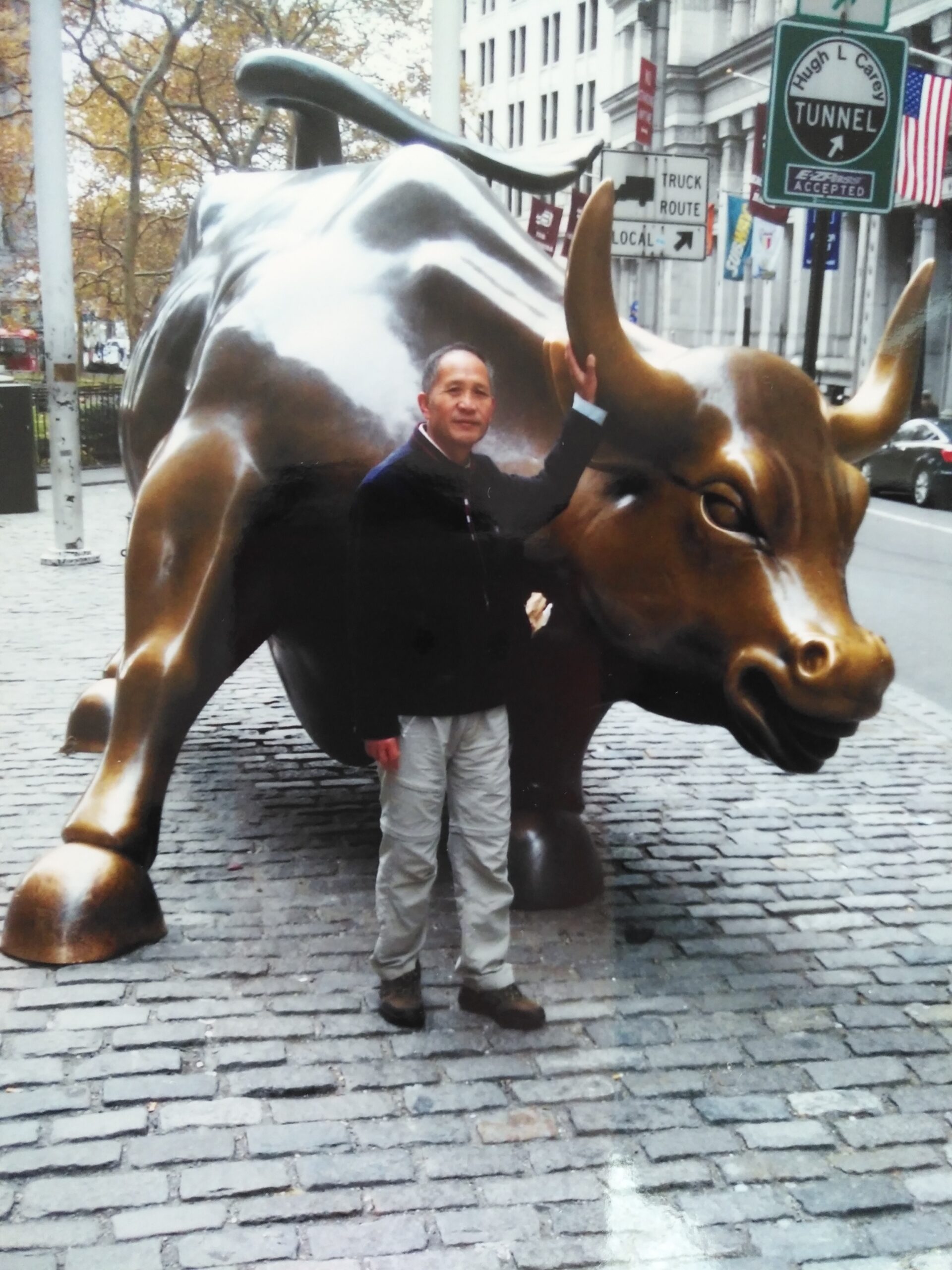 “哞——”老王将两手圈起来放在耳朵上,比划成“牛角”的样子,嘴里学了一声牛叫。他的这个动作,立即让来往的路人明白他要去哪里了。一个扫地的工人带着他转过一条街,就看到了华尔街那头著名的铜牛。