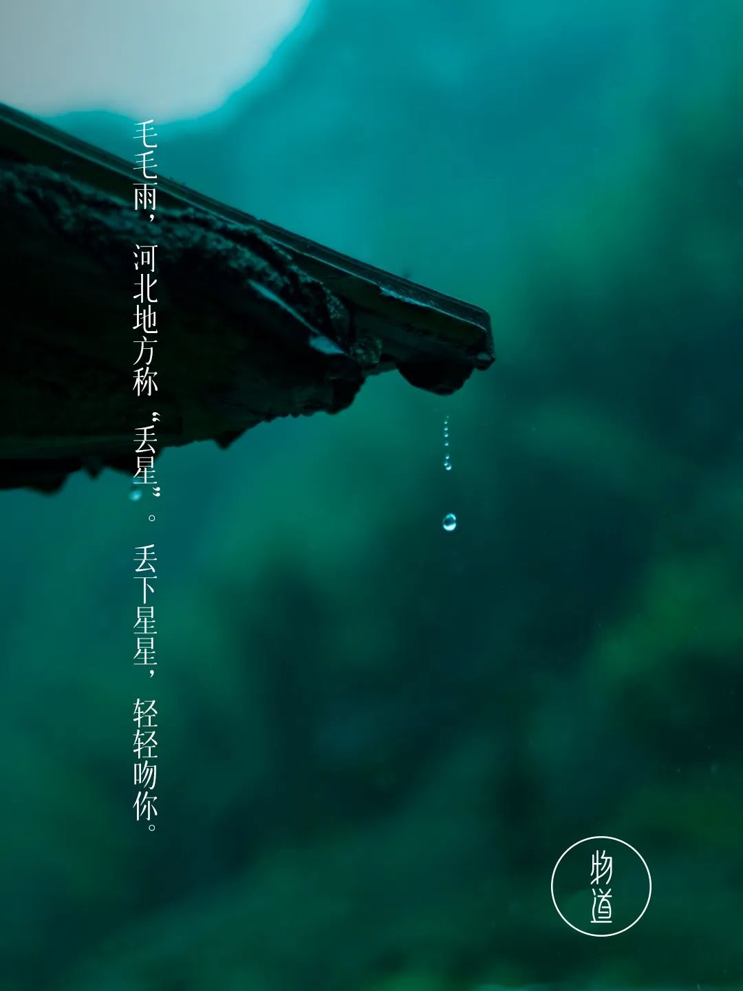 丢星——毛毛雨,河北地方的叫法。雨朵儿从天而降,就像有人站在天上,哗啦一下,把一堆星星丢了下来,然后轻轻落在你的脸颊上,就像星星的吻,冰冰凉凉