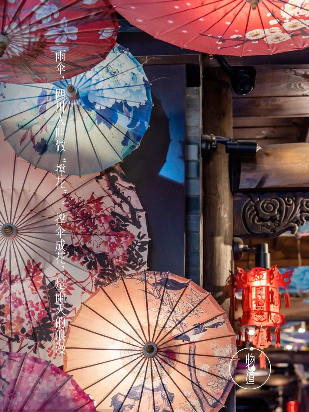 撑花——雨伞,来自四川地区的方言。伞面圆圆,伞把抬起,轻轻在手里一转,雨点纷飞,可不就是在手中撑起的一朵小花么!