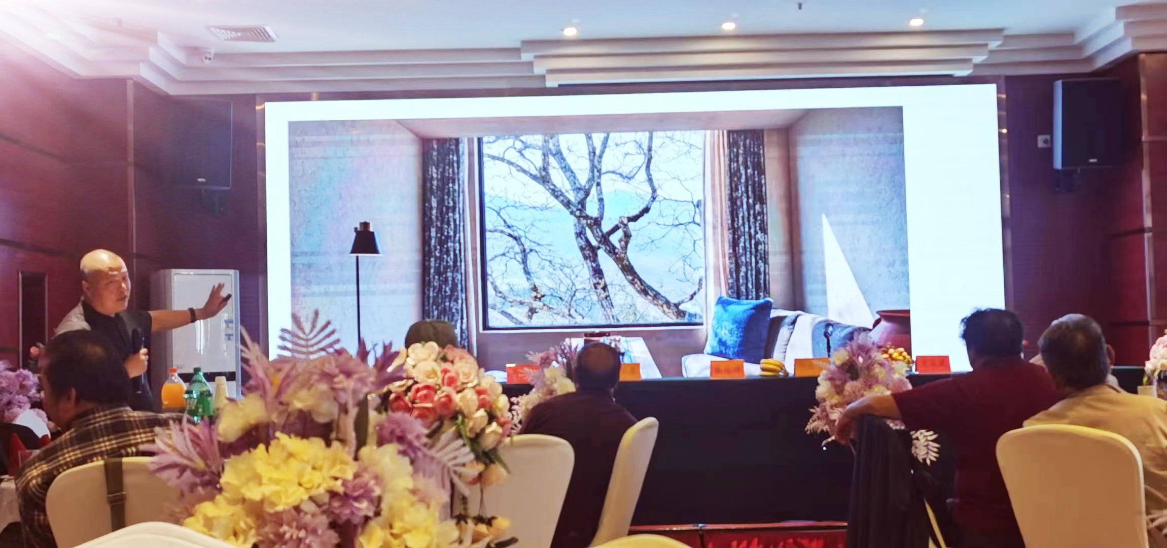 原红河州美协主席、研究馆员杨继高,美专委副主任、省文史馆馆员彭放,省文史馆书画研究员徐浡君,美专委副秘书长、云澳画院执行院长刘红,云南大学教授杨晓翔,西南林业大学教授王东焱,工艺美术大师、客座教授蓝嘉澍在会上介绍了近年来的艺术创作体会,以及乡镇建设中艺术设计的实用意义与实施效果,院校美术招生与毕业流向分析等。
