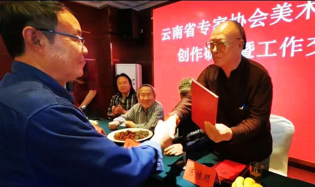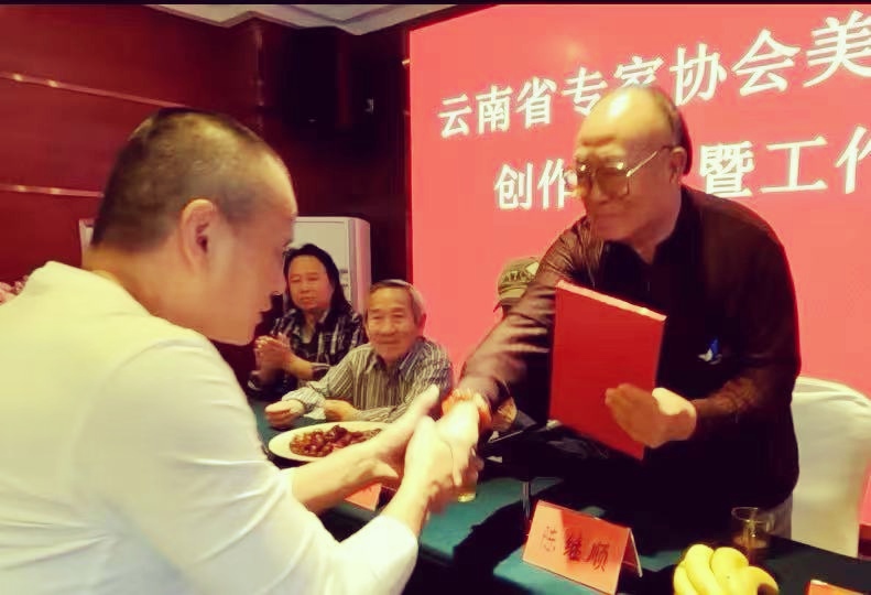 会议议程中云南省专家协会会长陈继顺向新聘任的美术专家委员会顾问天永茂颁发了聘书,向新聘任的美术专家委员会副主任杨继高、徐浡君两位分别颁发了聘书。