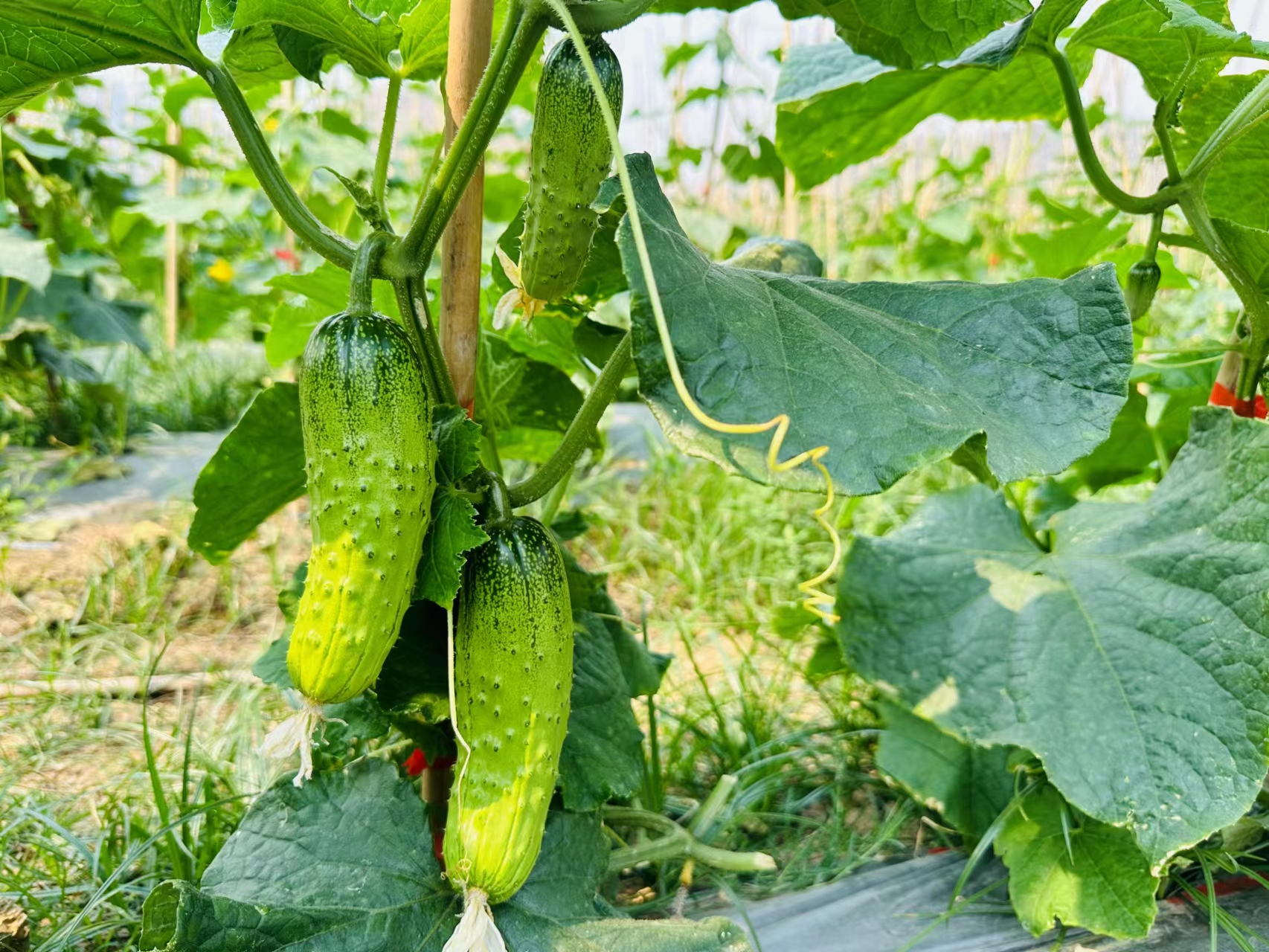 一根根鲜嫩的小黄瓜交错生长着绿色瓜叶的瓜蔓上,有的躲藏在瓜叶下,有的大大方方展示在阳光下,摘下一根轻轻一掰,伴随着“嘣”的一声,鲜美和甘甜便找上了舌尖。
