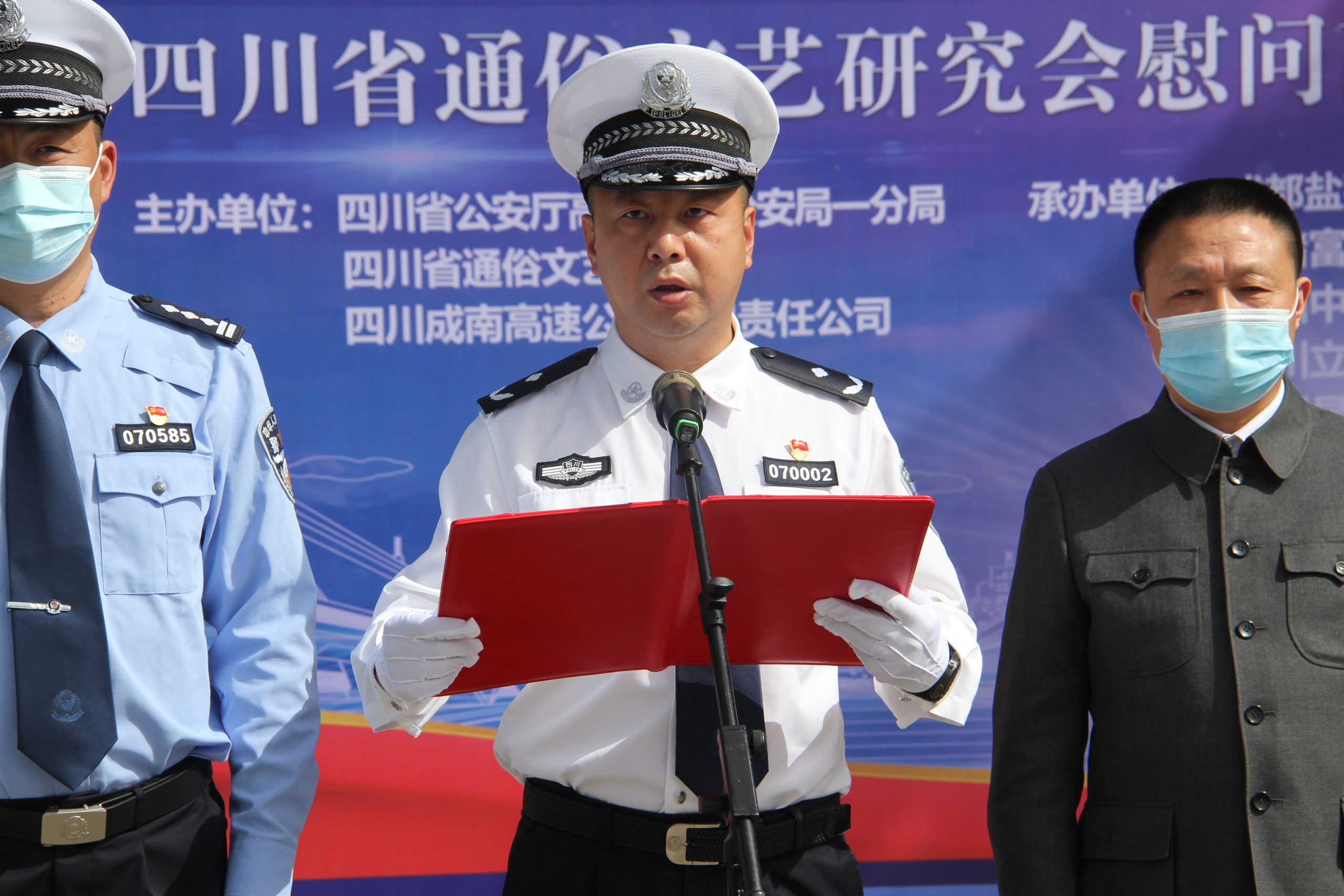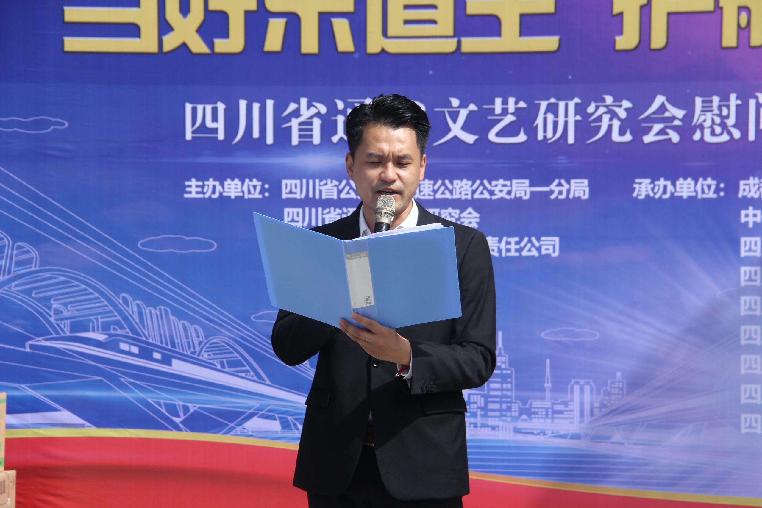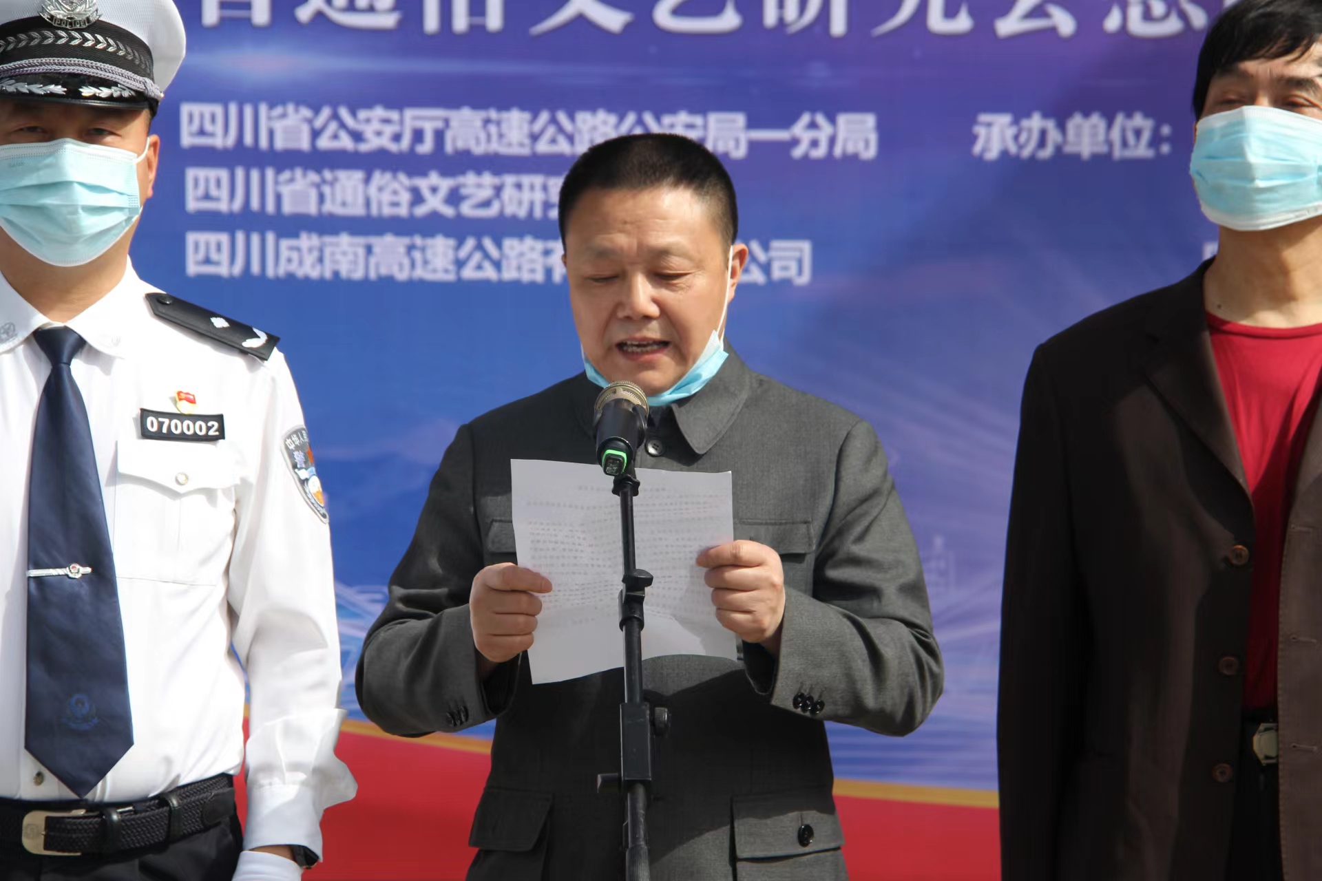 四川省通俗文艺研究会会长陈家甫代表研究会发表讲话,对高速公安同志们细致、耐心、认真、负责的工作和兢兢业业、公而忘私的精神表示感谢!并承诺遵守交通安全,平安出行,从我做起,为交通安全奉献⾃⼰的⼀份⼒量!