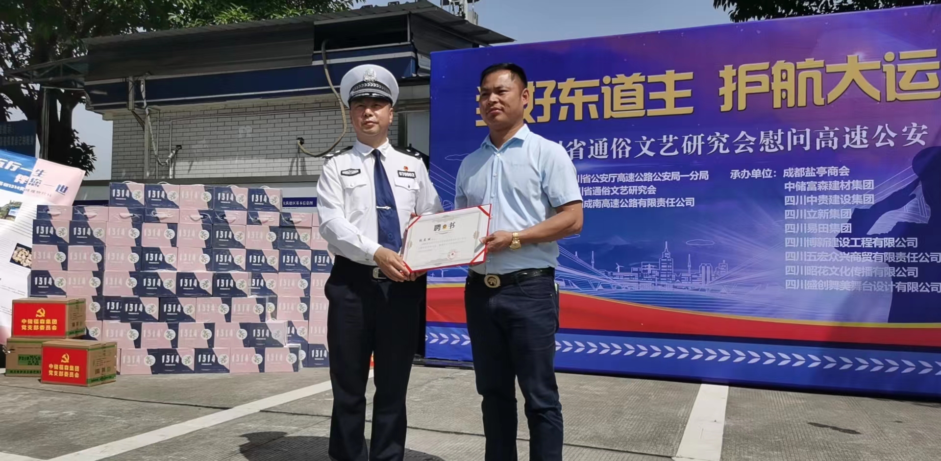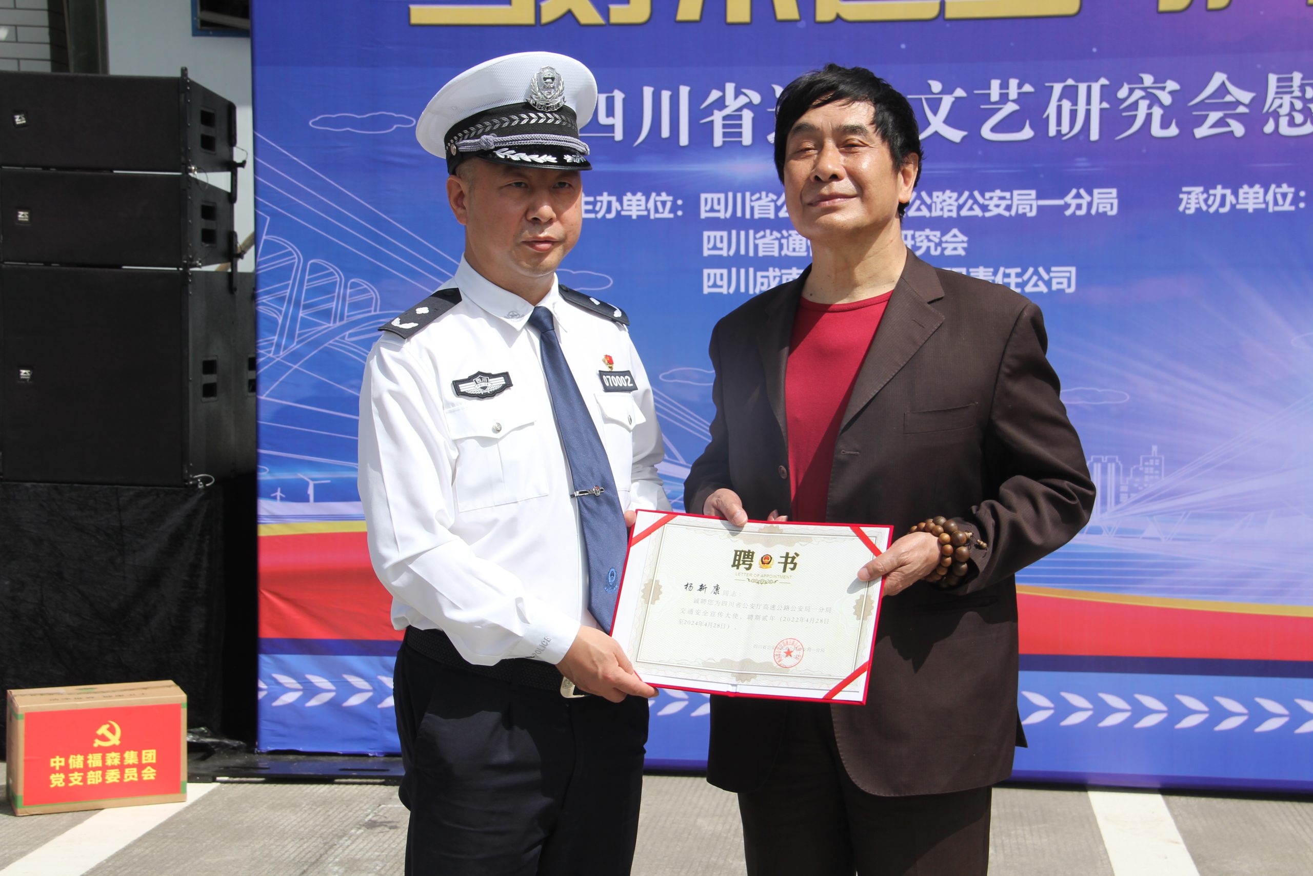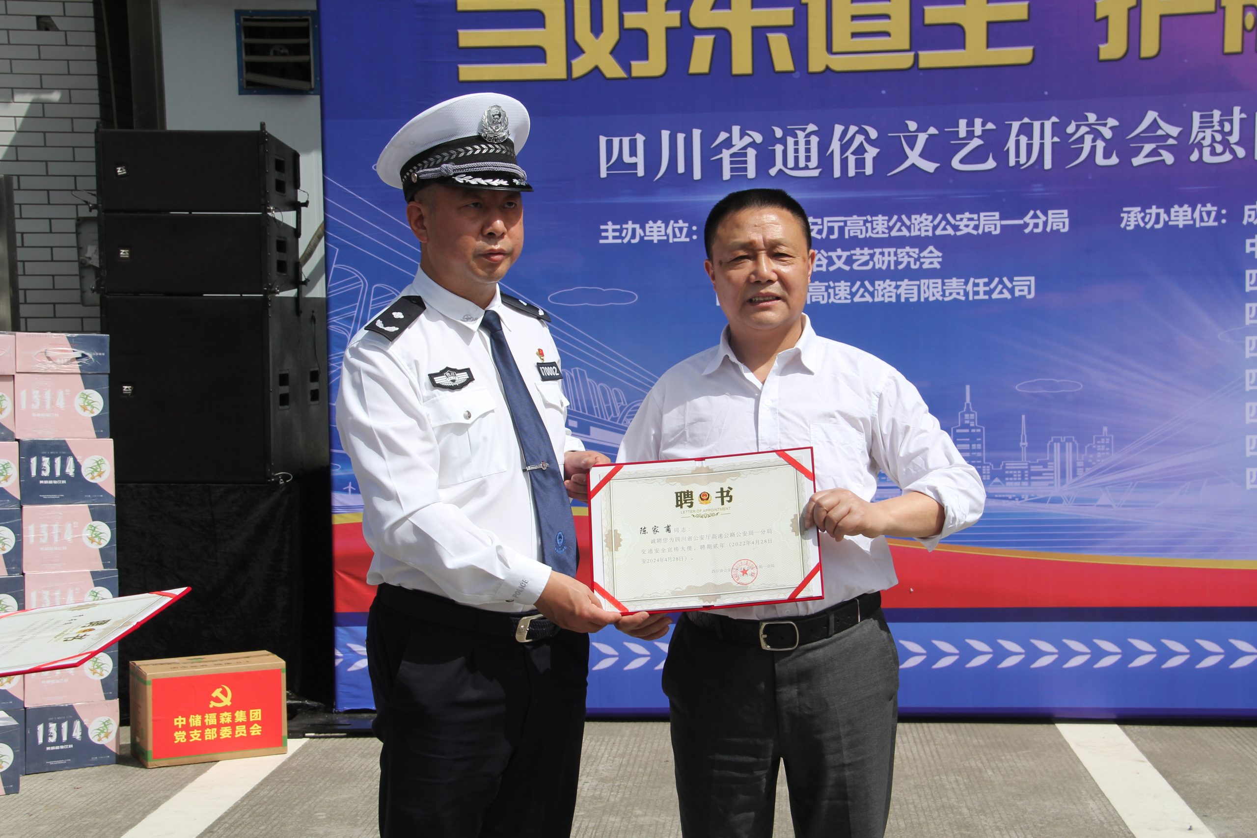节目表演后,四川省通俗文艺研究会参与此次慰问活动的爱心企业家们为分局民辅警代表送上爱心物资。四川省公安厅高速公路公安局一分局政委徐晓松、副局长袁垅为爱心企业家、文艺工作者:陈家甫、杨新康、陈汶虎、滕德素、袁杰、李书伟、张美丽、袁勇军、江仕钧、潘伟、文静、汪思光、曾伟、陈勇、邓林分别颁发了“警风警纪监督员”、“交通安全宣传大使”聘书,并勉励文艺工作者通过文艺形式传播交通安全知识,倡导企业家积极履行社会责任,为社会主义经济建设贡献自己的力量,积极参与交通安全宣传的活动当中。